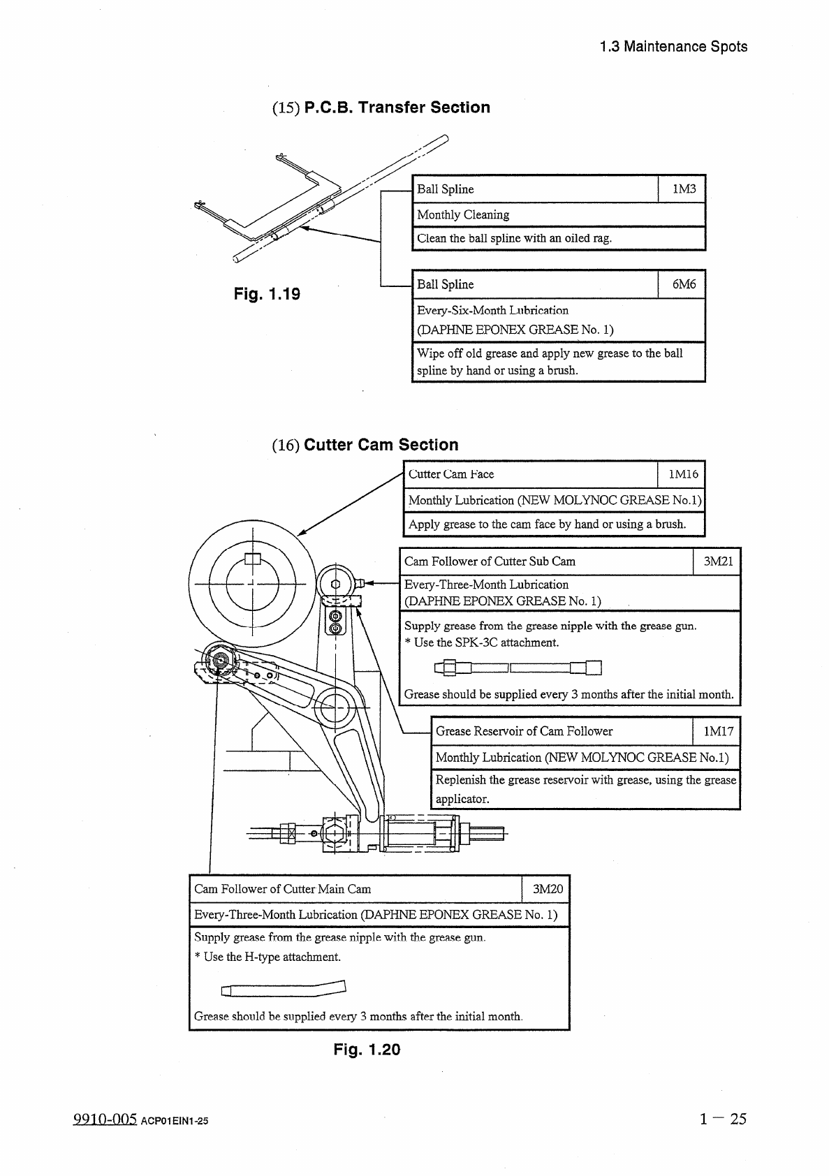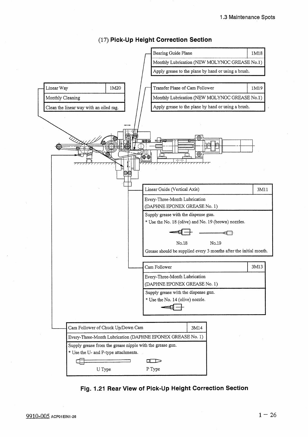 1.3 Maintenance Spots ( 17 ) Pick - Up Height Correction Section Bearing Guide Plane 1 M 18 Monthly Lubrication ( NEW MOLYNOC GREASE No . l ) Apply grease to the plane by hand or using a brush . Transfer Plane of Cam Fol…