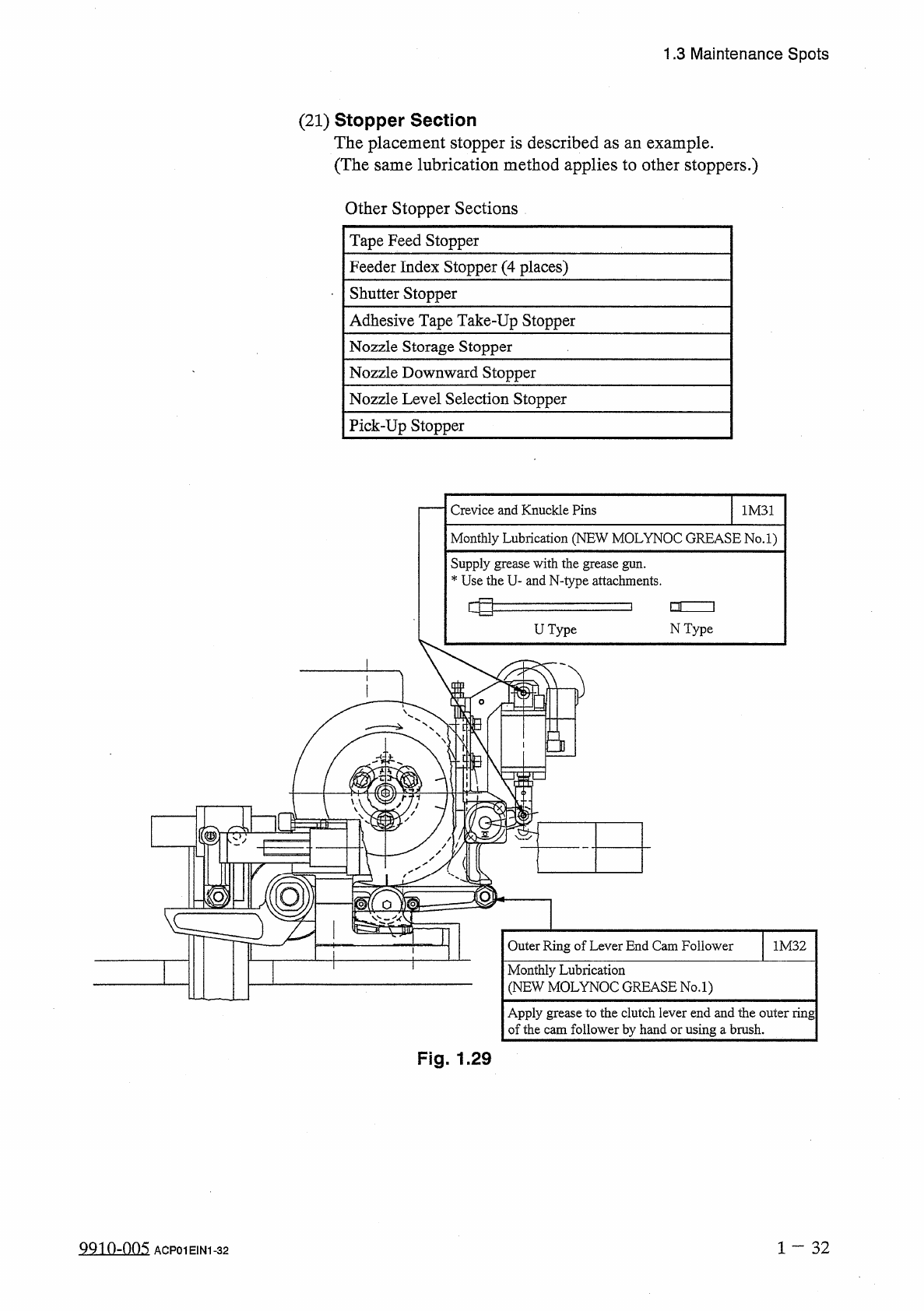 1.3 Maintenance Spots ( 22 ) Upper Section of Tape Feed Unit Rod End 6 M 9 Every - Six - Month Lubrication ( DAPHNE EPONEX GREASE No . 1 ) Supply new grease from the grease nipple with the grease gun . * Use “ ① Combinat…