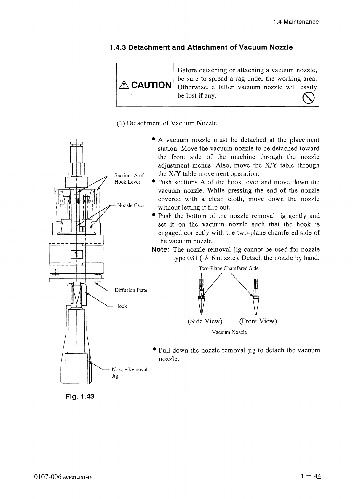 1.4 Maintenance Notes : ( a ) Do not score the diffusion plate while detaching a vacuum nozzle . ( b ) A miniature stroke bearing is used at the nozzle up / down movement section which consists of the shaft , the retaine…