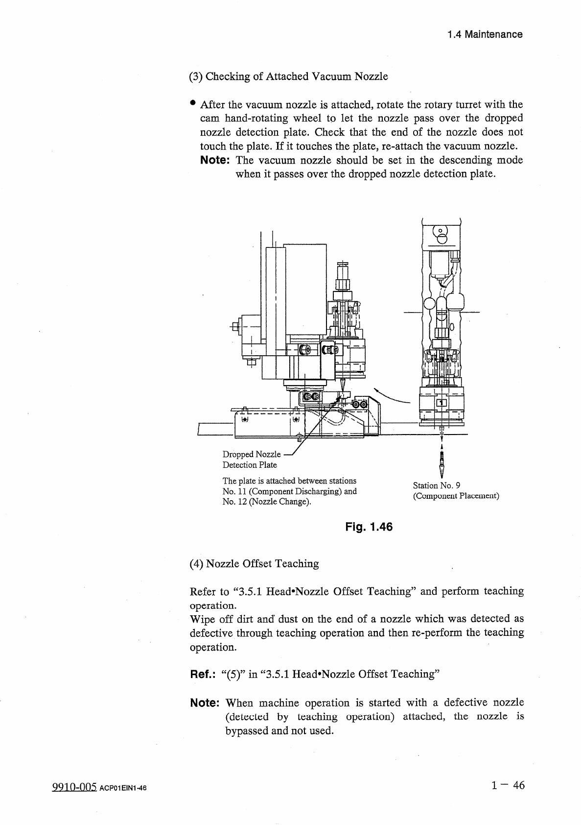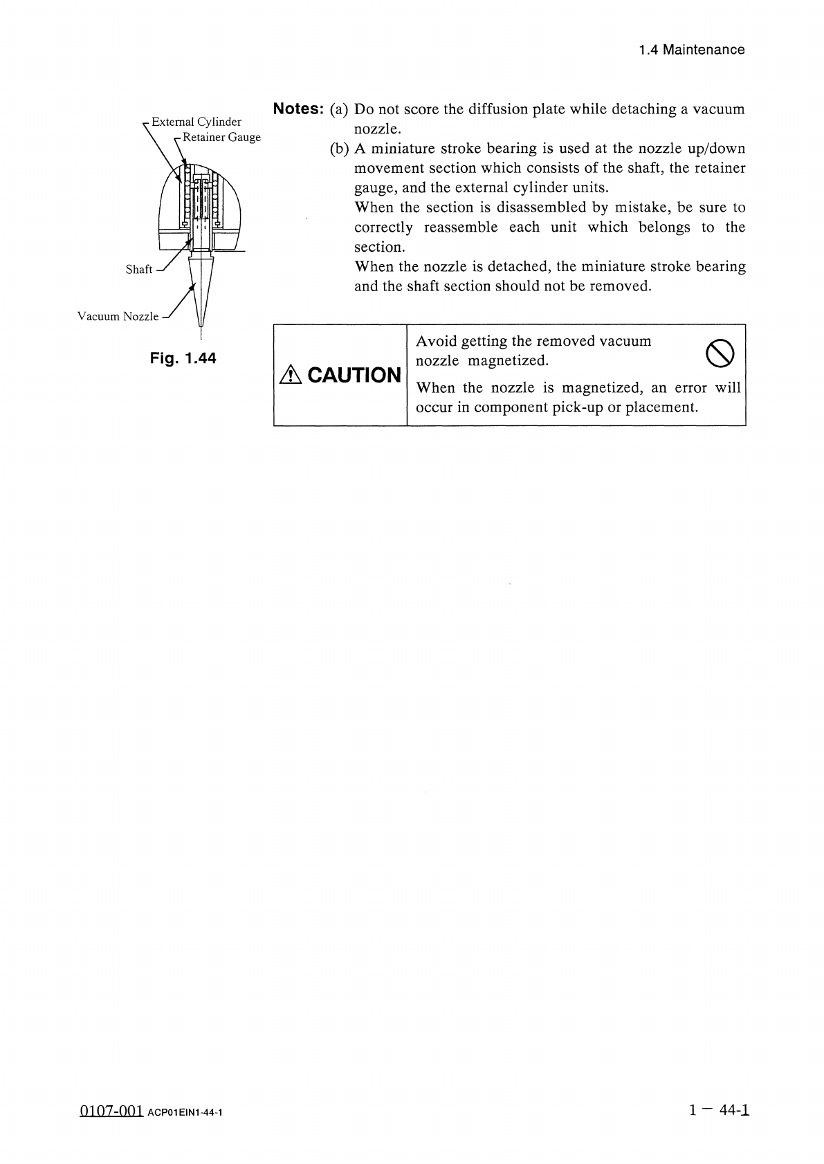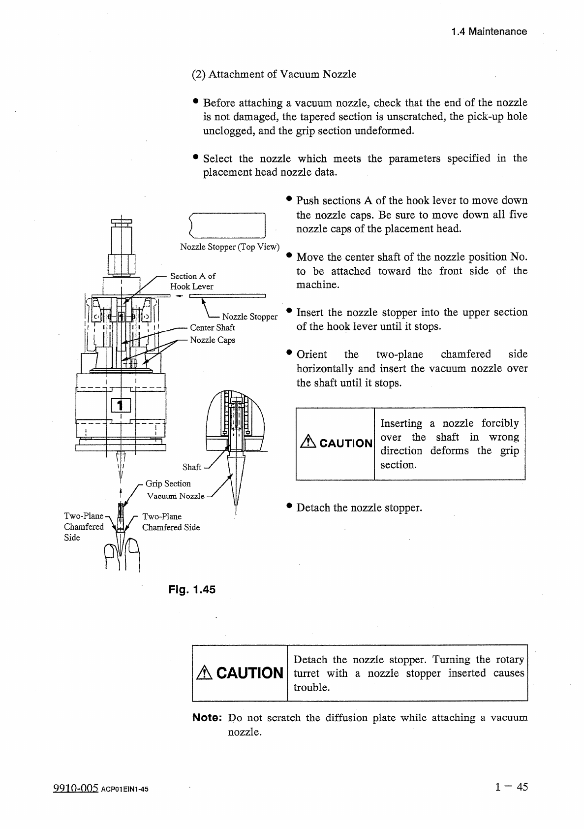 1.4 Maintenance ( 2 ) Attachment of Vacuum Nozzle • Before attaching a vacuum nozzle , check that the end of the nozzle is not damaged , the tapered section is unscratched , the pick - up hole unclogged , and the grip se…