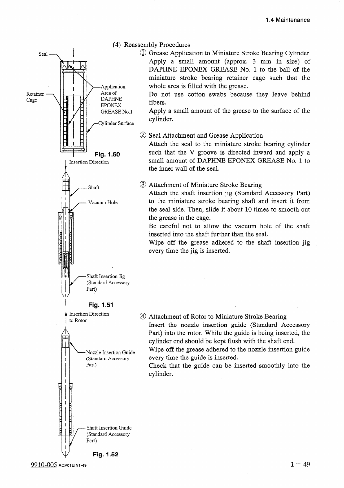 1.4 Maintenance ( 3 ) Cleaning and Air Blowing ① Cleaning of Miniature Stroke Bearing • Disassemble the miniature stroke bearing into three parts ( shaft , outer cylinder , and seal ) and wash them with kerosene ( exclud…