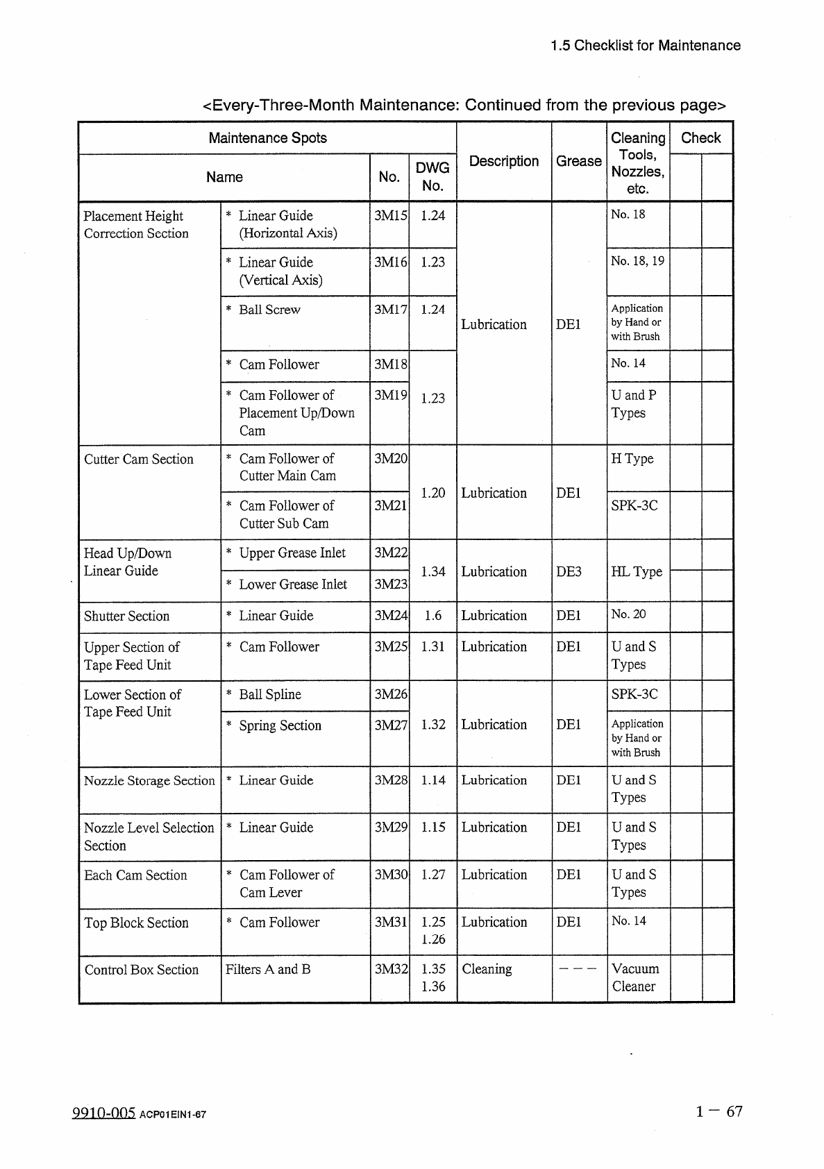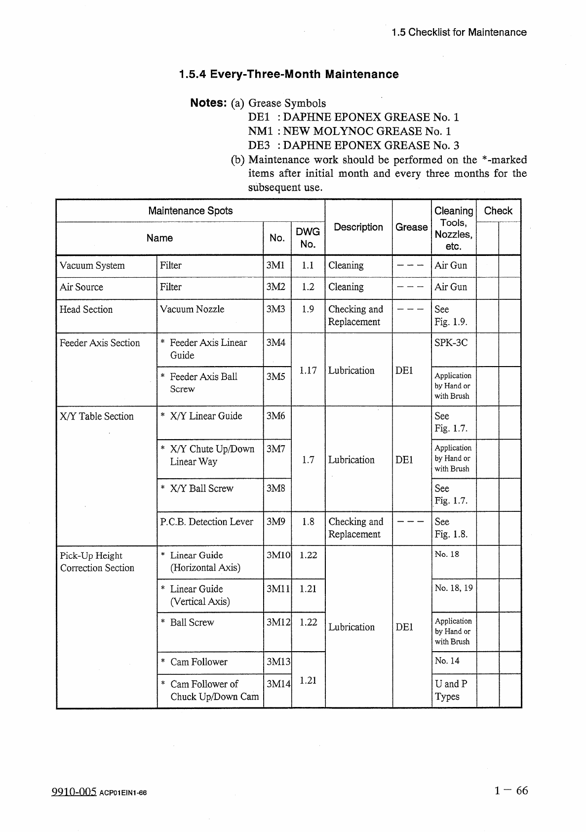 1.5 Checklist for Maintenance 1.5 . 4 Every - Three - Month Maintenance Notes : ( a ) Grease Symbols DEI : DAPHNE EPONEX GREASE No . 1 NM 1 : NEW MOLYNOC GREASE No . 1 DE 3 : DAPHNE EPONEX GREASE No . 3 ( b ) Maintenance…