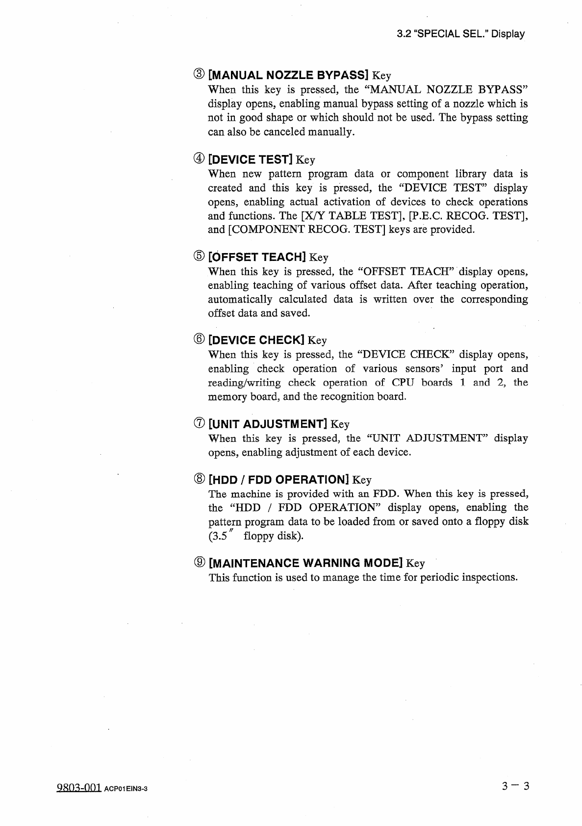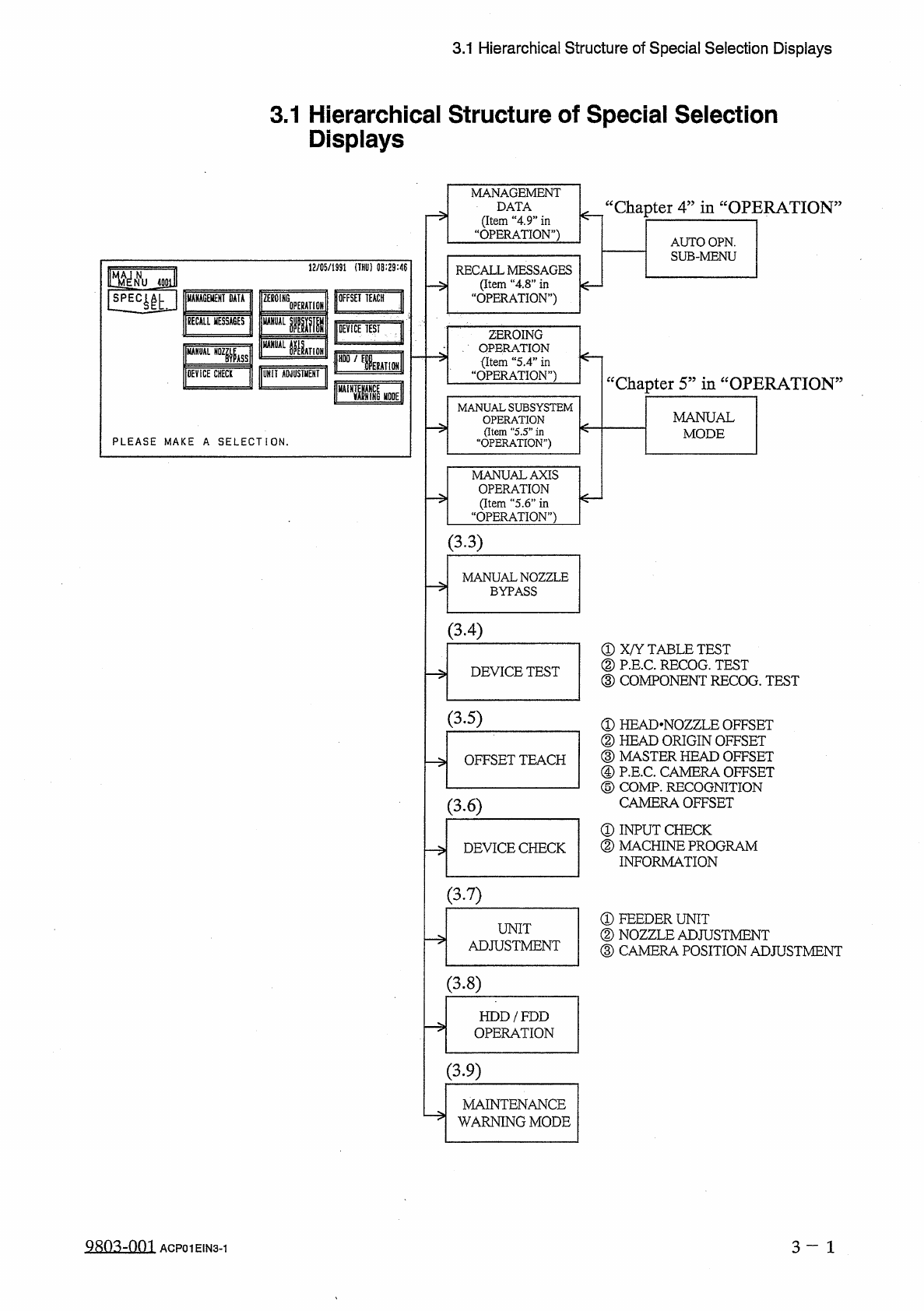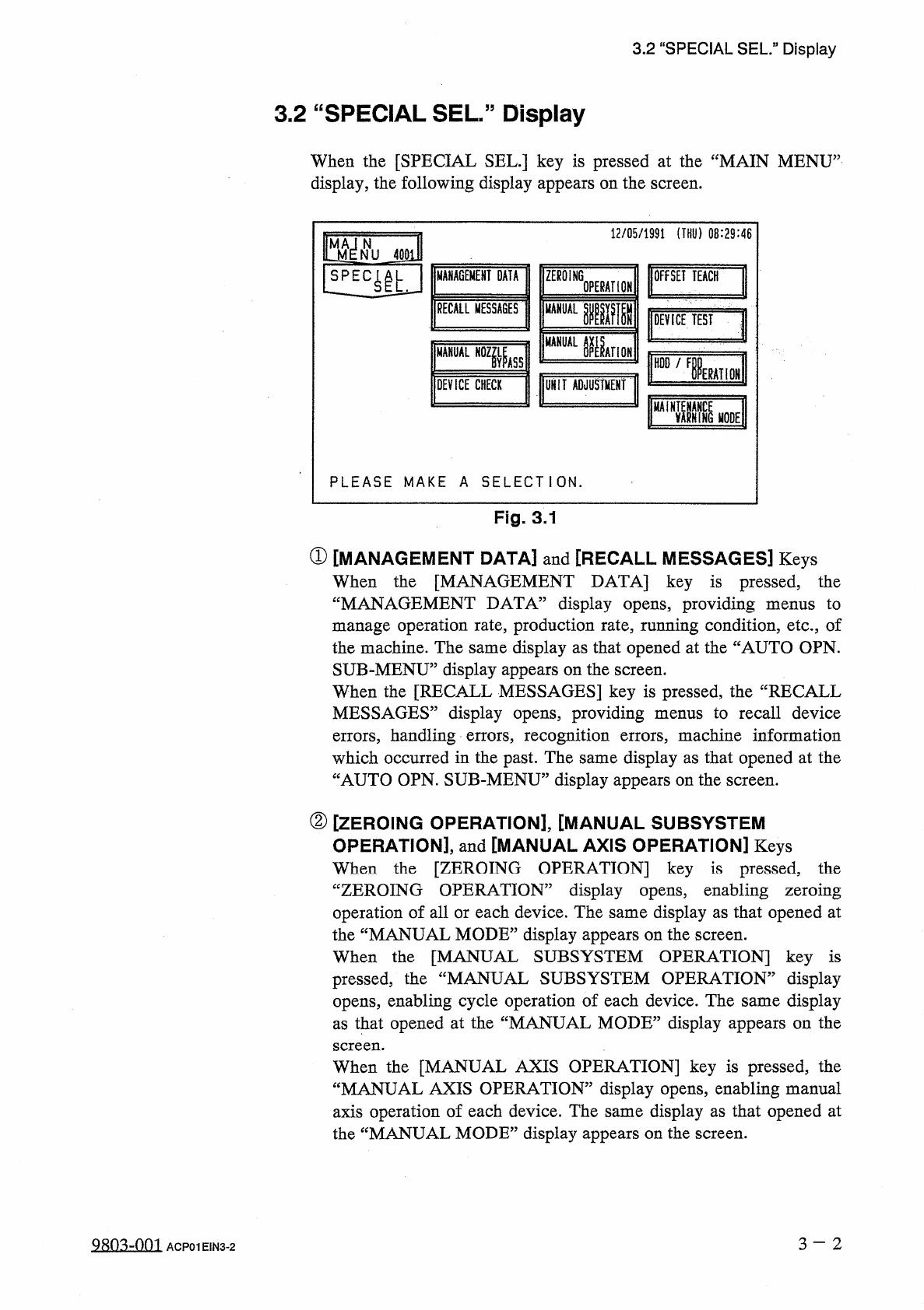 3.2 " SPECIAL SEL . " Display 3.2 “ SPECIAL SEL . 55 Display When the [ SPECIAL SEL . ] key is pressed at the “ MAIN MENU ” display , the following display appears on the screen . 12 / 05 / 1991 ( THU ) 08 : 29…