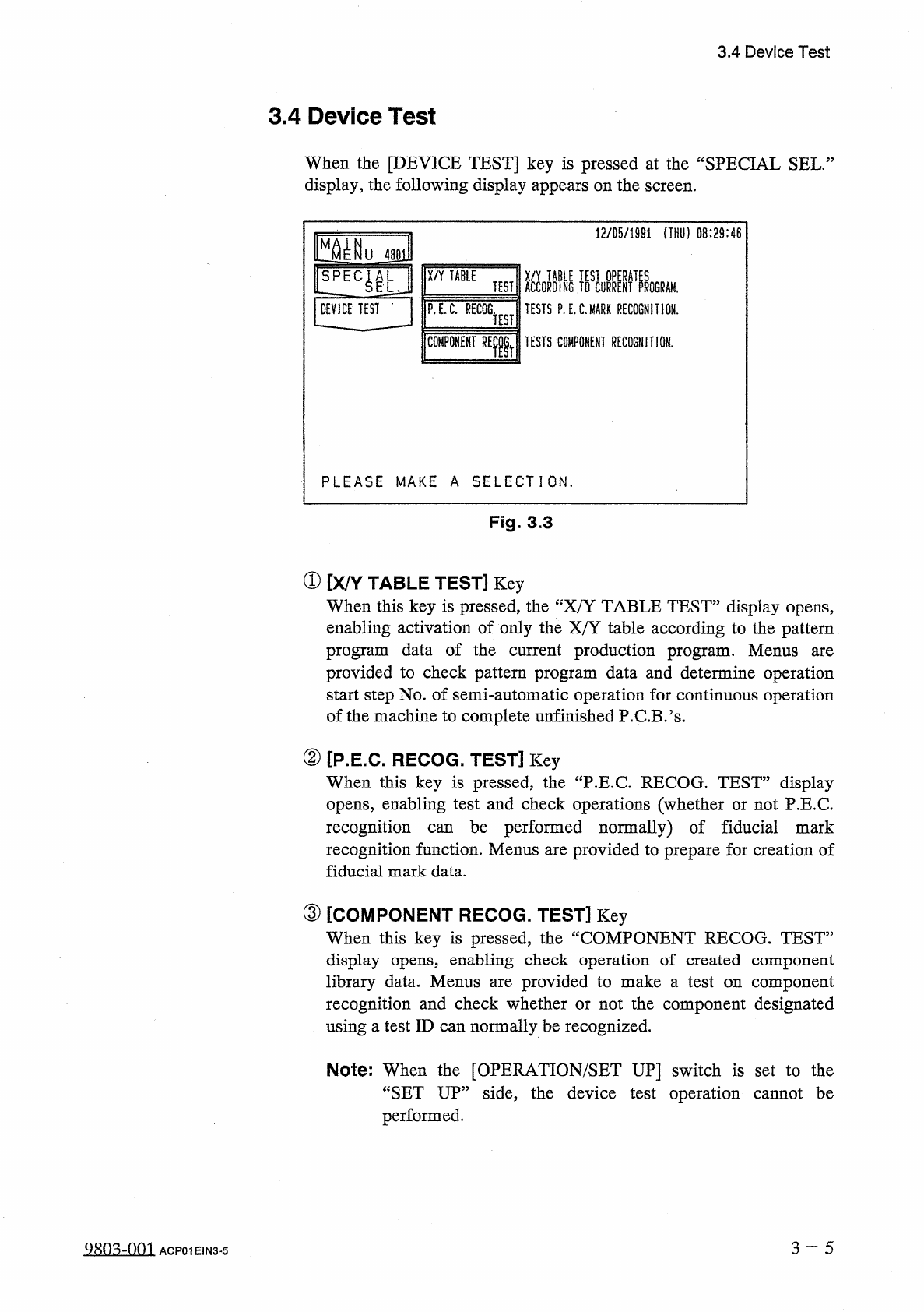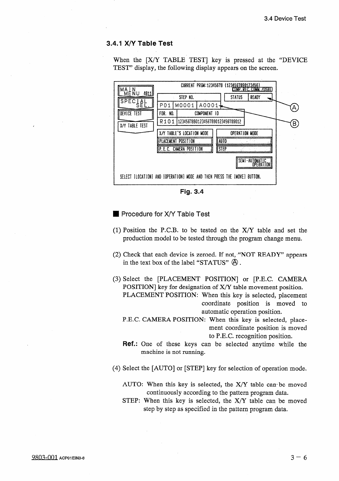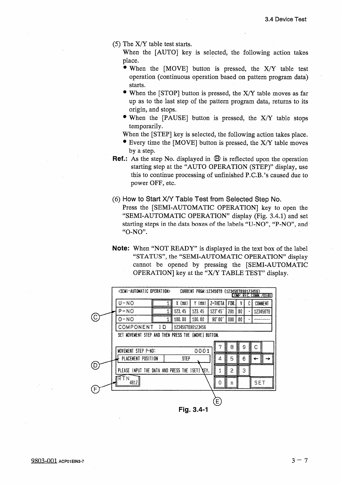 3.4 Device Test 3.4 . 1 X / Y Table Test When the [ X / Y TABLE TEST ] key is pressed at the “ DEVICE TEST ” display , the following display appears on the screen . : 12 丽 8 ( 123 Mbm CURRENT PRGM : STEP NO . STATUS READ…