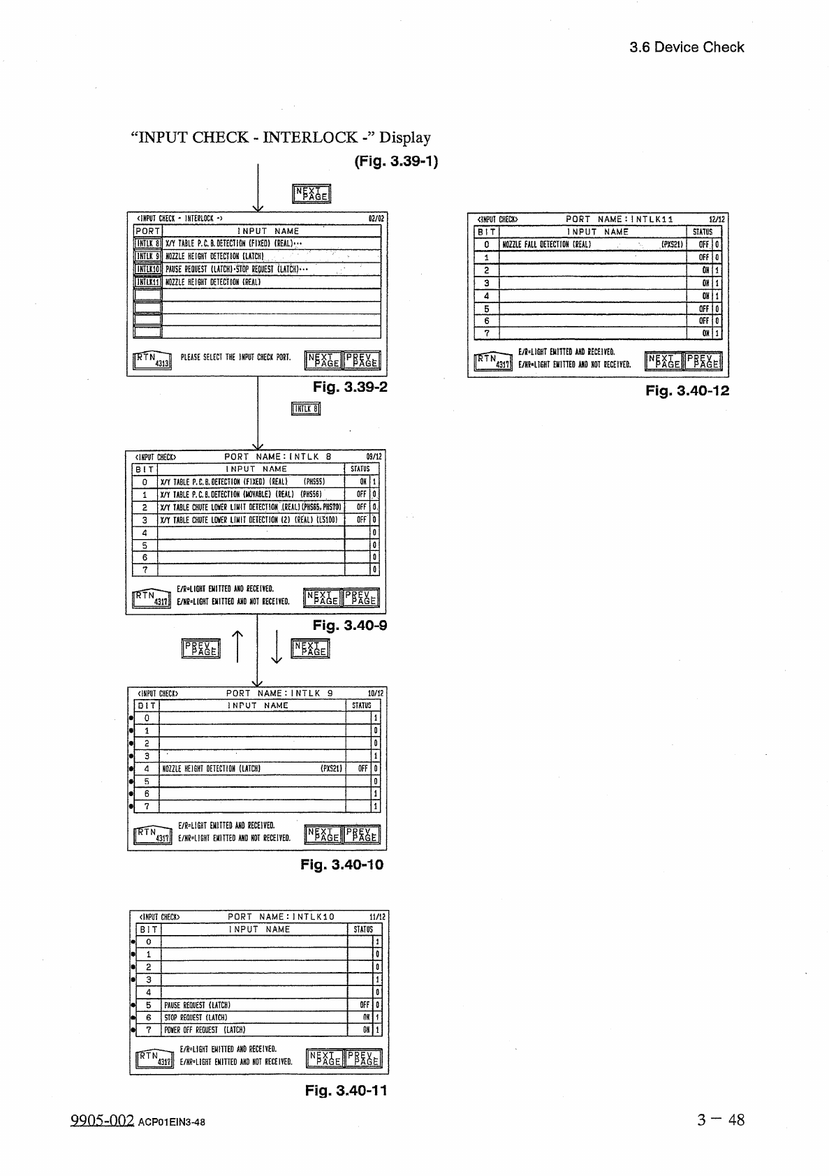 3.6 Device Check u INPUT CHECK ” Display ( Fig . 3.36 ) 3 MOTOR CONTROL < HiPUT mi > PORT NAME : M DD - i < ! HPUT CHECK - UOIOS COHTKOL - ) 01 / 06 01 / 44 BIT PORT INPUT NAME INPUT NAME STATUS 0 COUUNO DISABLE…
