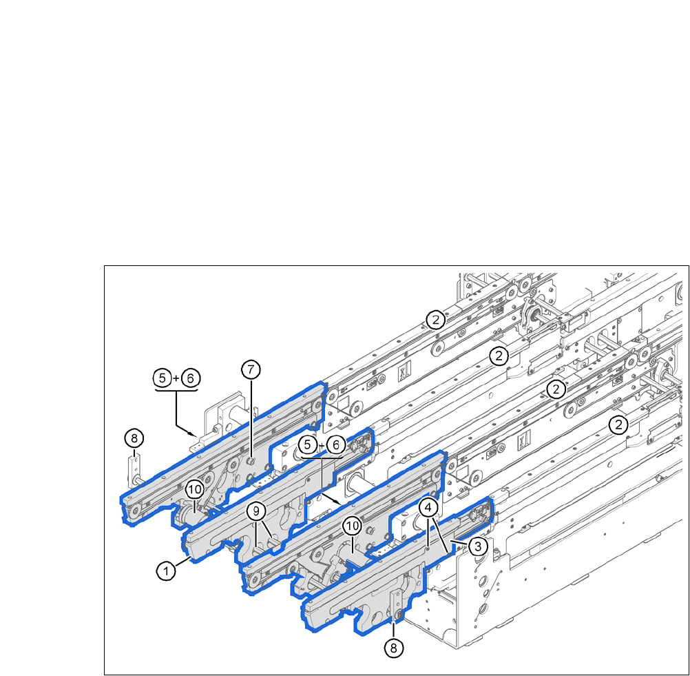 拆卸输入传送导轨 (图 5.5 - 13 中的物件 1)的电缆盖 (图 5.5 - 13 中的物件 3 与 5)。