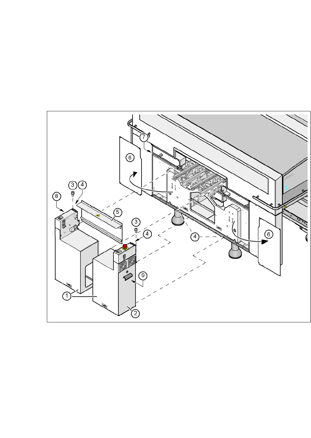 将此侧边(图 5.5 - 13 中的物件 1)小心地贴放在处理传送导轨的侧边上(图 5.5 - 13 中的物