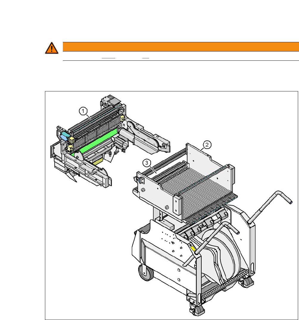 在装入和卸出元件料车时存在夹伤肢体的危险!