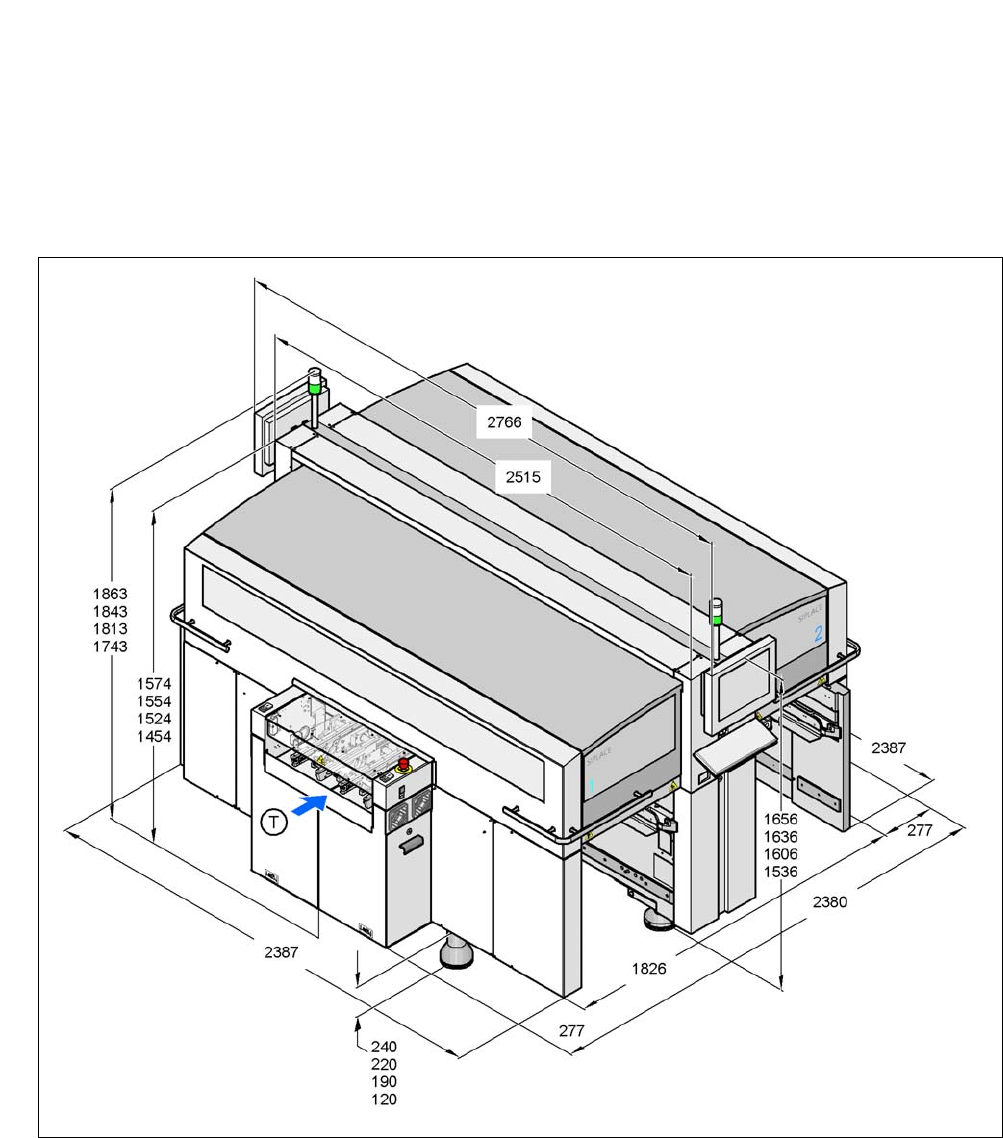 3 技术数据 《用户手册》 SIPLACE CA- 系列 3.4 SIPLACE CA 的尺寸和重量 使用软件版本 SC.708.0 或更新 2014 年 12 月版 简体中文 124 3.4 SIPLACE CA 的尺寸和重量 3.4.1 CA4 贴片机尺寸 3 图 3.4 - 1 CA4 设备的尺寸 (基本贴片机) ,以毫米为单 位 (T) PCB 输送方向