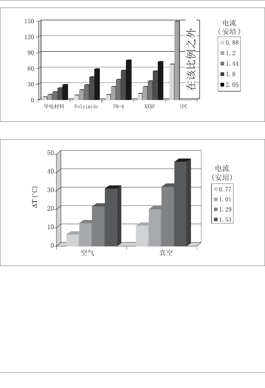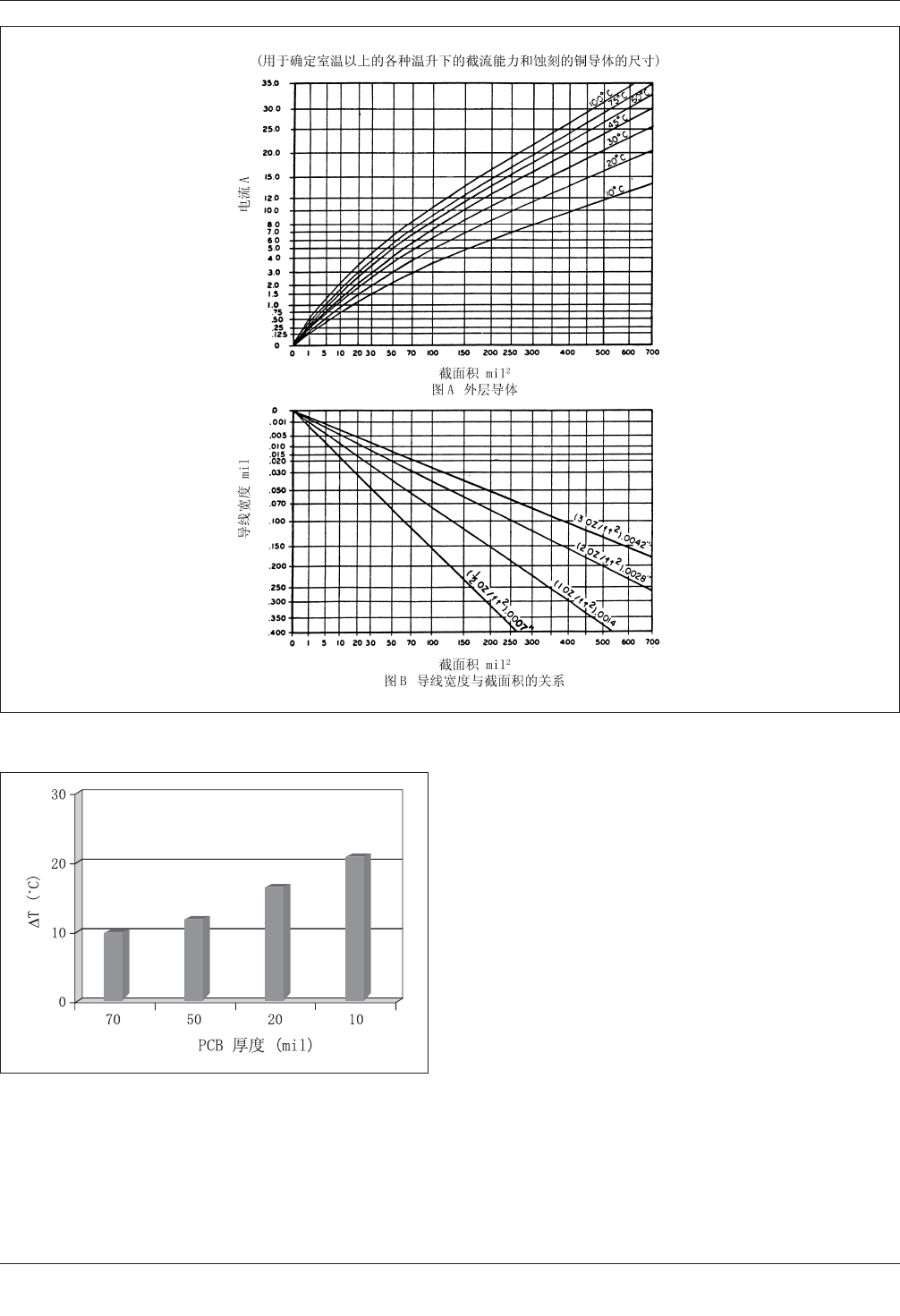 图 B-4 是 帮助说明 现 有的 内 层导 体 图表 与从 任务组 研究 的结 果之 间的不 一致 的。电 流 是施 加到一 块 印制板结构 中相 同 尺寸 的导线 上 的。 在所有 情况 中 的 唯 一区 别是 板材的热 学 性能。 IPC的 △ T或T 差 是 用 代 表IPC 内 层导 体 图表的等 式确 定的。 这 表明了 使用外 层导 体 图表 中 的电 流 值 的 一半 的 保 守 性。 酚醛 、 被 称作XXX P 、 …