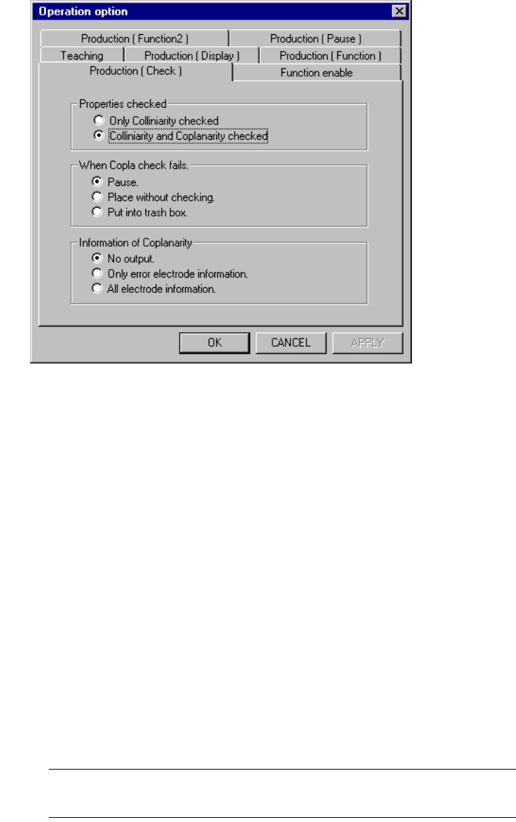 12 − 17 12.4.6 Setting the Production (Check) option W hen y ou select the [ Options] com mand on the menu bar , then [ Option Sett ing] command on the O ptions menu, t he Operation opt ion setting dialog box appears on …