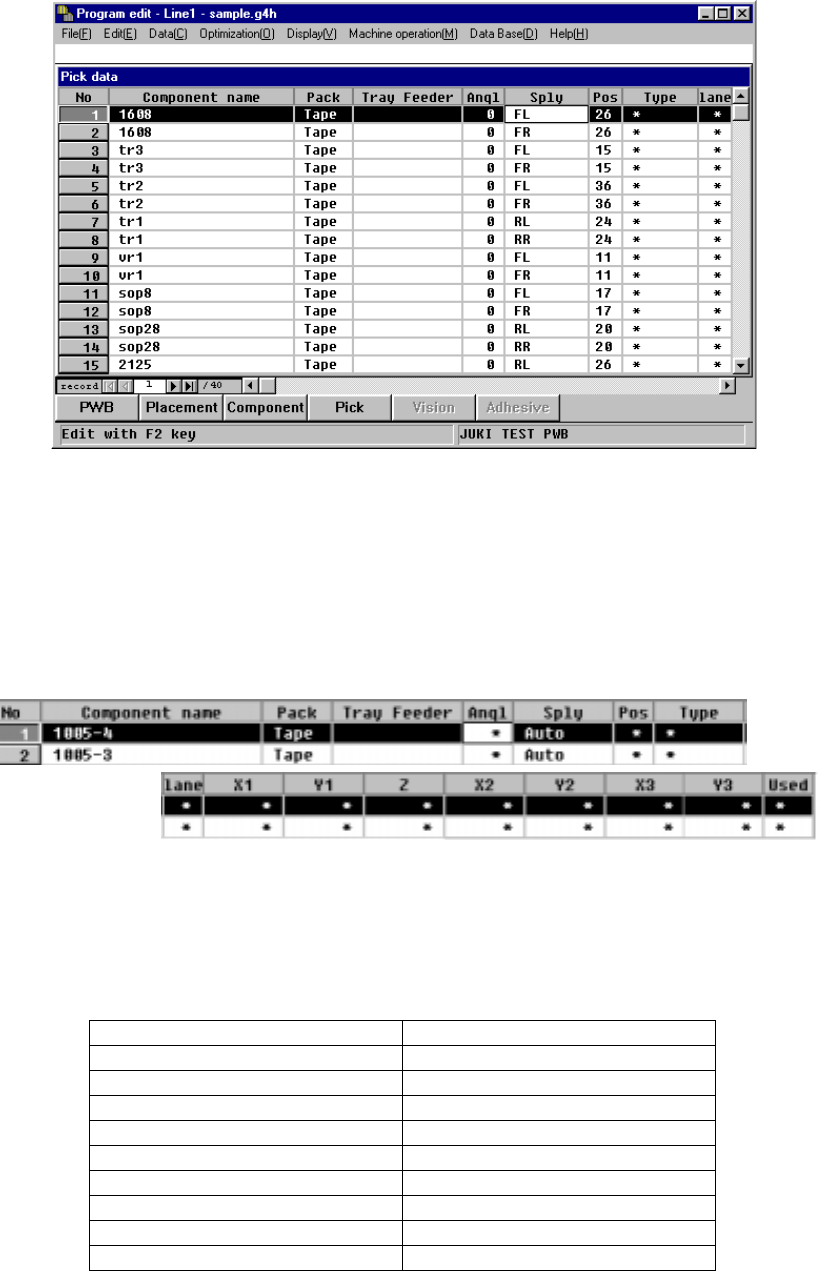 4 – 107 4.8.2 How to enter data In the f ields “Component nam e”, “Pack .”, “Tray Feeder” and “Angle”, values you entered on the PW B data screen and Component data screen appear . The input f ocus is positioned in t he …