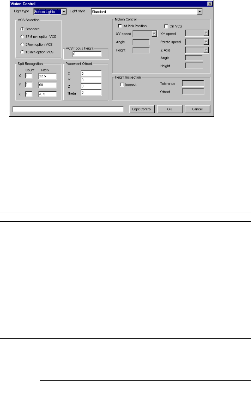 5 − 73 Item Descripti on VCS Selection Select a VCS used for rec ognizing a c omponent : Standard (50 m m) 37.5 m m opti on VCS 27 mm option V CS 18 mm option V CS VCS Focus Height Specify t he height the V CS recognizes…