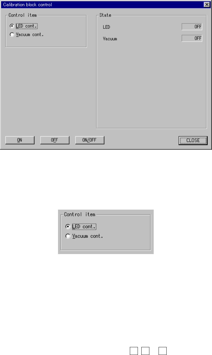 9 − 65 9.6.5 Calibration block control W hen you select the [Others] command on the [Ctrl] menu, then the [Calib ration block contr ol] comm and, the f ollowing “Calibration block contr ol” dialog box appears on the scre…