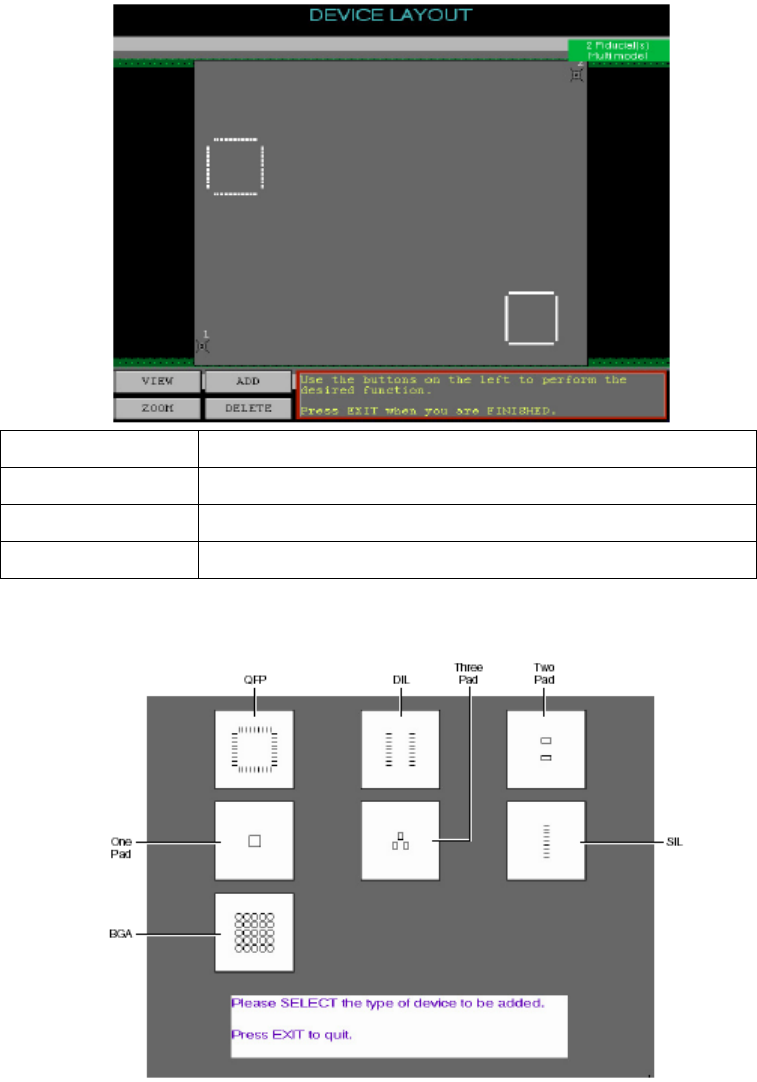 ADD 增加一個 2D 檢查零件 DELETE 刪除一個 2D 檢查零件 VIEW 察看 2D 檢查零件 ZOOM 將點選到位置放大與縮小 按 ADD 之後,出現下列訊息視窗: Please SELECT the type of device to be added. (請選擇新增2D零件型式) Press EXIT to quit. ( 按 EXIT 離開) 選擇 QFP 零件時 Move the trackball pointer …