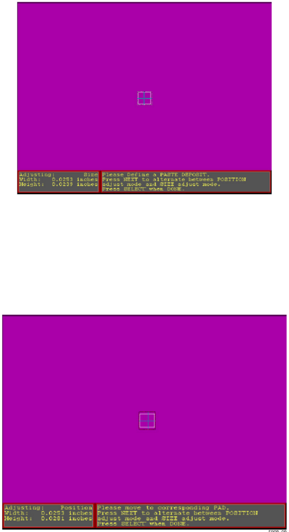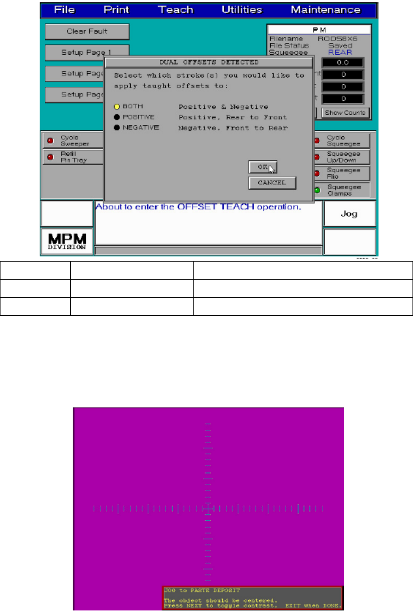 BOTH Positive & Negative 正、負方向都套用位置修正值 POSITIVE Positive, Rear to Front 正方向套用位置修正值,由後到前刮印 NEGATIVE Negative, Front to Rear 負方向套用位置修正值,由前到後刮印 按 OK 之後,出現下列訊息及視窗: JOG to PASTE DEPOSIT. The object should be centered. (移動搜尋框到…