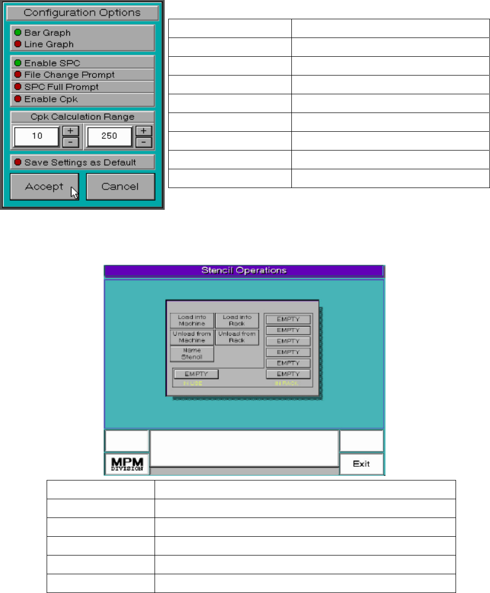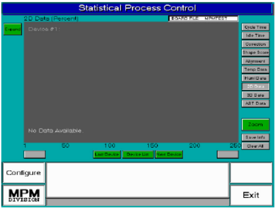 6. SPC Data:生產管制圖 從 Utilities 下拉選單中,選 SPC Data 後出現下列視窗 Expand :展開Y軸圖表放大曲線變化量 Cycle Time : 顯示機器再印刷時所花的時間 , 如有擦拭時 , 時間必會加長曲線圖 Idle Time :機器印刷時在等待送板與初版時間曲線圖 Correction :顯示每片板子進入印刷位置與鋼板對位時,X、Y、Theta移動值 Shape Score …