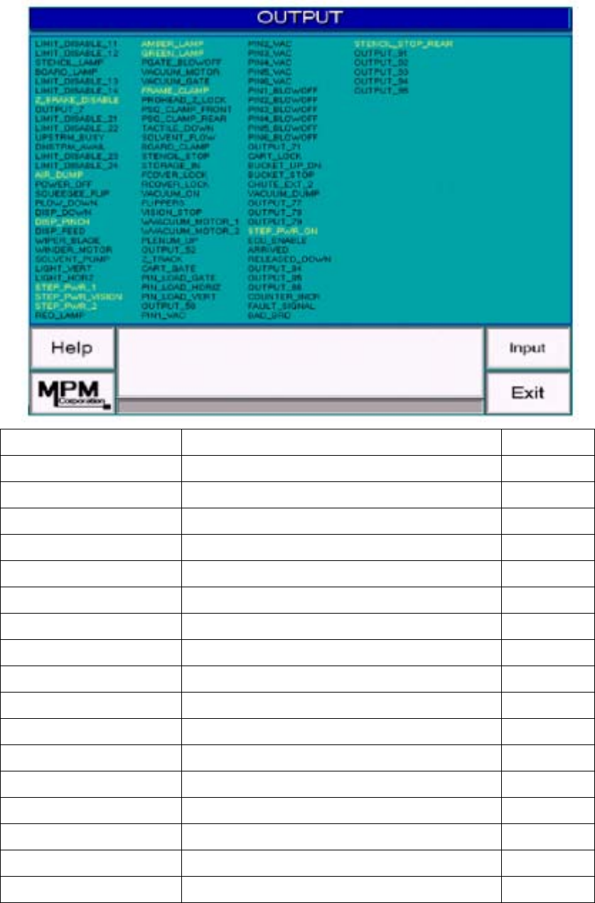 12. Reset:將各軸歸零。因每次關機時各軸位置不定,所以只要一開機時,主畫面會自 動出現Reset動作 從 Maintenance 下拉選單中,選 Reset 後出現下列訊息及視窗 按 BEGIN 後開始執行各軸馬達歸零 2. Output Test:進入Output畫面,此功能可測試各項硬體控制 從 Maintenance 下拉選單中,選 Output Test 後進入測試視窗 53