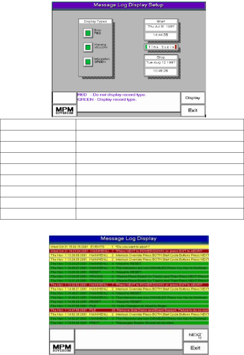 Display 進入Message Log Display顯示機器所有訊息視窗 Error RED 只顯示錯誤訊息視窗(燈塔紅燈訊息) Warning YELLOW 只顯示警告訊息視窗(燈塔黃燈訊息) Information GREEN 只顯示所有一般訊息視窗(燈塔綠燈訊息) Start 顯示開始訊息時間 Stop 顯示結束訊息時間 Time Scale 用軌跡球調整起始時間與結束時間 Exit 離開機器所有訊息設定視窗 NEXT 顯示…