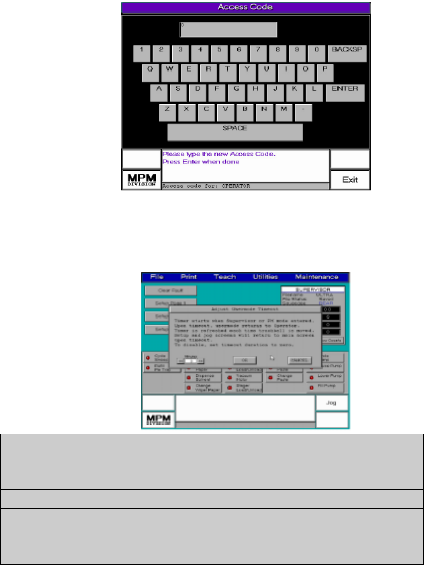 顯示的項目為綠色、不顯示的項目為紅色,設定完成後,即可進入下一等級,以做 繼續的設定。 4. 用 EXIT 鍵儲存新的設定,並可退回主畫面或進入其他使用者模式。 ※從Maintenance下拉選單中,選User Mode後出進入視窗後,再由User Mode畫面中選取 右下Access,則進更改密碼設定 9. Usermode Timer:限制使用者模式,使用時間 從 Maintenance 下拉選單中,選 Usermode Timer…