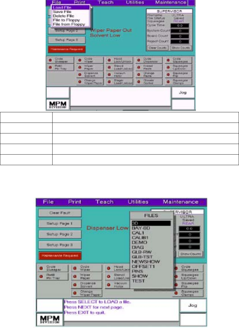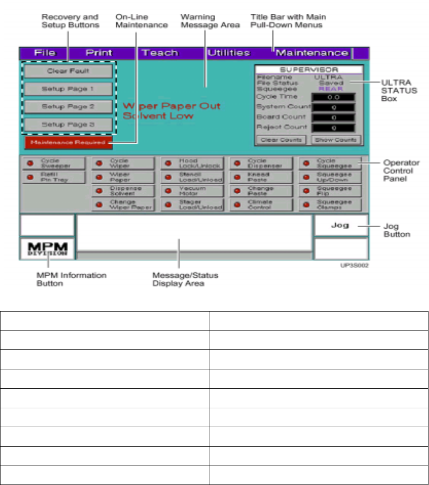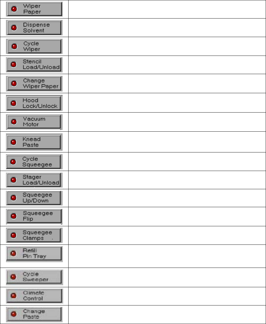 啟動捲紙馬達按鈕 啟動溶劑幫浦按鈕 啟動擦拭鋼板按鈕 啟動載入鋼板按鈕 啟動換紙按鈕 啟動關門門鎖按鈕 啟動真空馬達按鈕 啟動攪拌錫膏功能 更換前後刮刀起始方向按鈕 將剛板退倒後面鋼板暫存區 啟動刮刀高度馬達上下按鈕(必需測完刮刀高度) 更換前後刮刀方向按鈕 啟動夾住刮刀汽缸按鈕(無刮刀時千萬不要啟動) 啟動掃除平台上支撐頂針按鈕(執行後平台會轉90度,影像系統 後面掃除頂針隔板下降,清除平台頂針(OPTION) 更換頂針供應盤上位置按…