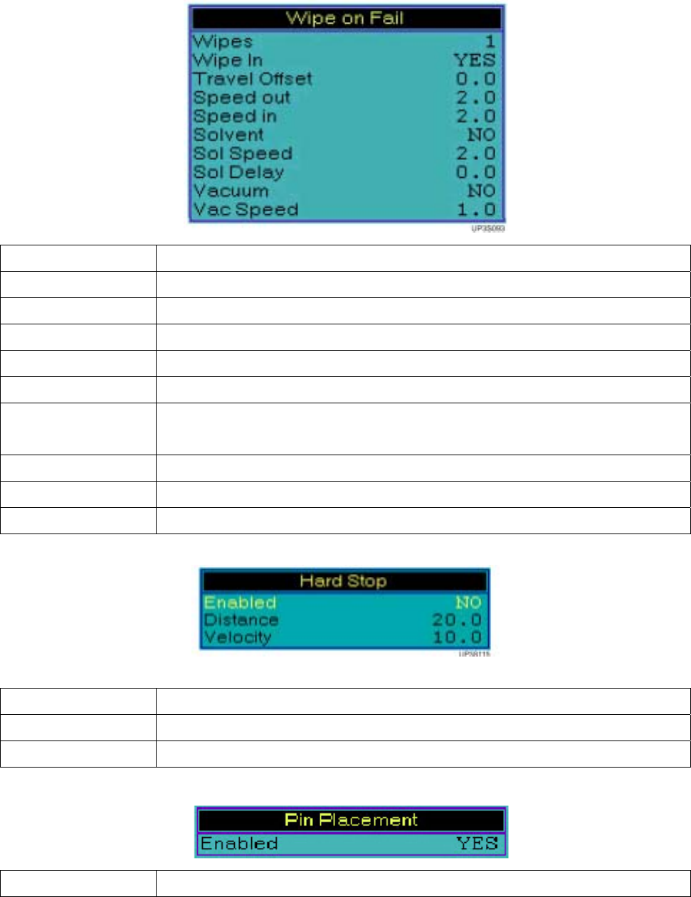 Wipes 設定當2D錫膏覆蓋率檢驗基板不良,針對鋼板再做擦拭的次數(1-100) Wipe In 設定擦拭時,Wipe 回去是否要做擦拭功能(Yes/No) Travel Offset 設定擦拭時的範圍是否要加寬( ± 50.8mm) Speed Out 設定擦拭機構出來的速度(5.08m/m~203.2m/m/sec) Speed In 設定擦拭機構回去的速度(5.08m/m~203.2m/m/sec) Solvent 設定是否要使…