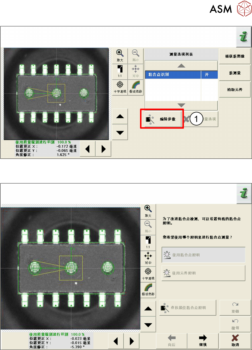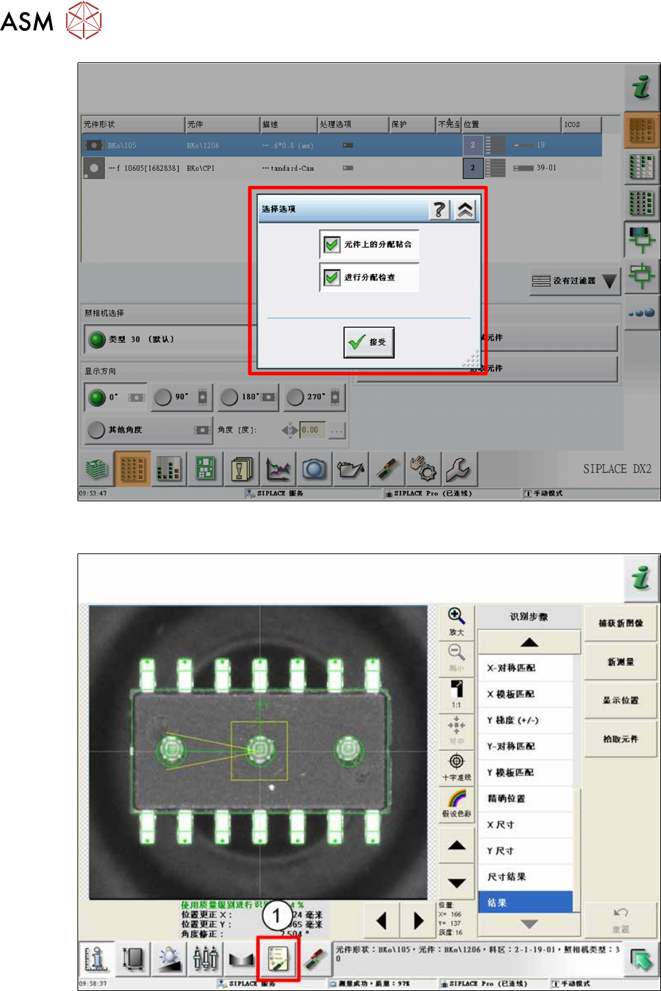 4 操作 4.2 706.1 及更高版本工作站软件的个别功能 52 用户手册 SIPLACE Glue Feeder 05/2020 ► 启用所显示的全部两个选项,然后点击 接受 。 处理随即开始。之后 SIPLACE 视像检测结果视图将出现在屏幕上。 ► 点击 测量选项 图标。 (1)