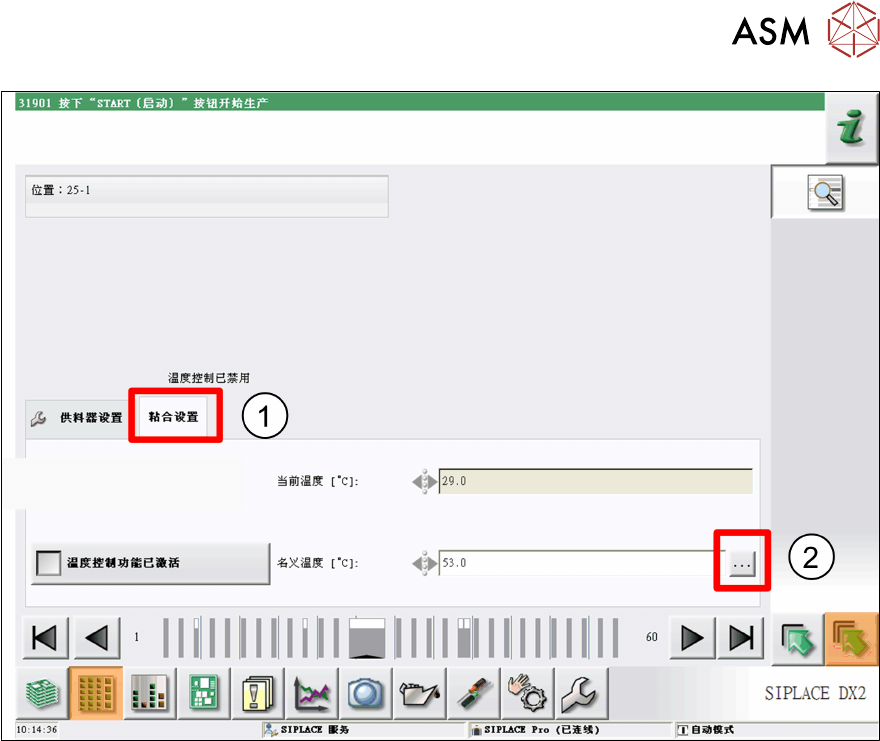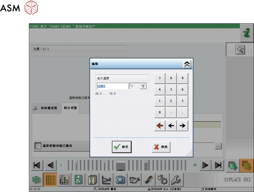 4 操作 4.2 706.1 及更高版本工作站软件的个别功能 56 用户手册 SIPLACE Glue Feeder 05/2020 ► 使用数字键设置需要的标称温度。 ► 点击 接受 以保存设置。