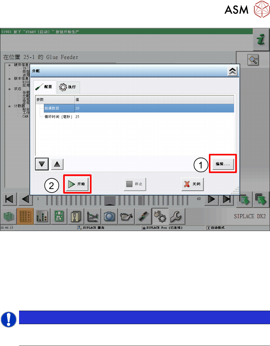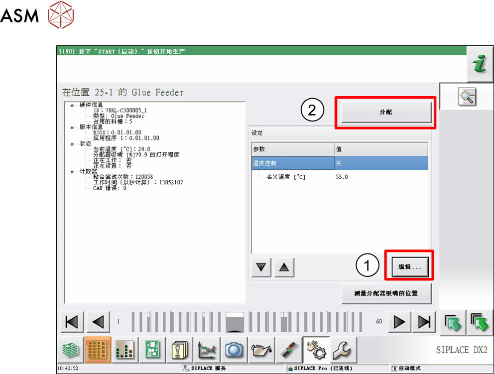 4 操作 4.2 706.1 及更高版本工作站软件的个别功能 64 用户手册 SIPLACE Glue Feeder 05/2020 ► 如有必要,您还可以更改胶液的标称温度。 如要执行此操作,打开 设置 ,标记 标称温度 条目后点击 编辑 。 (1) 在接下来显示的对话中按照需要调整温度,然后点击 接受 。 ► 点击 分注 开始检测胶液。 (2)