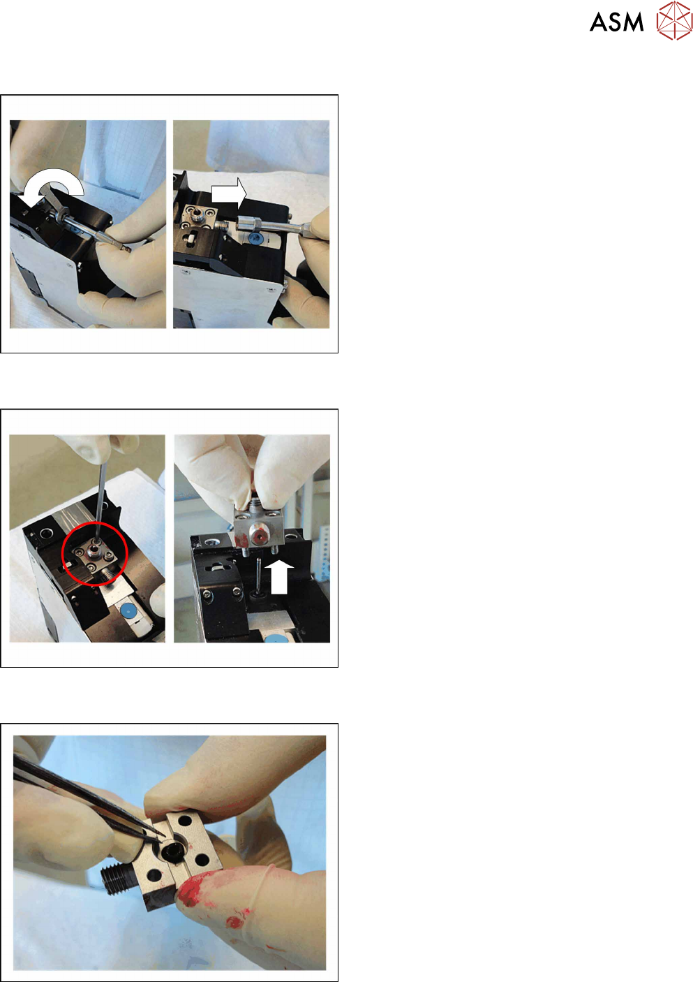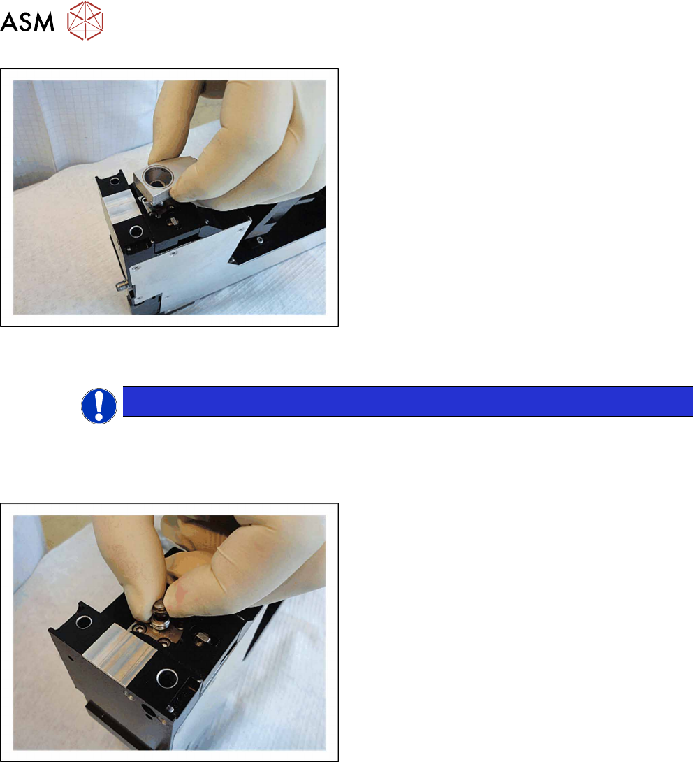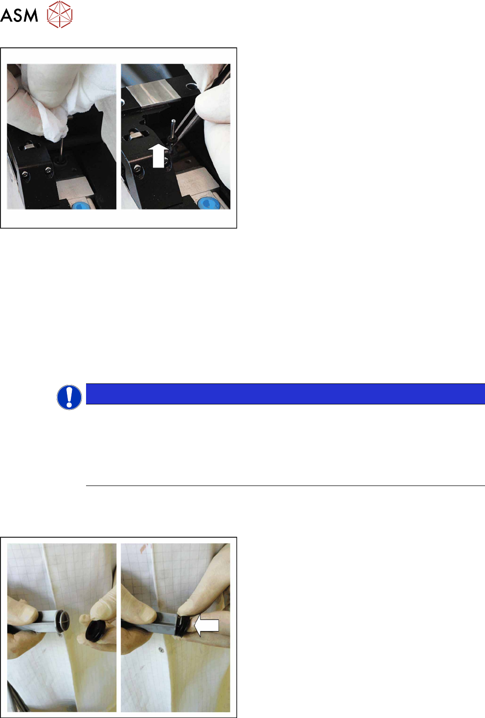 5 清洁和维护 5.4 清洁和检查上胶单元 用户手册 SIPLACE Glue Feeder 05/2020 77 5.4.1.4 拆卸胶液盒管 ► 用一只手紧握住胶液盒管。 ► 使用一个 8 mm 开口扳手拧松接口。 ► 移除胶液盒管。 5.4.1.5 移除喷射块 ► 拧松固定喷射块的 4 颗螺丝。 ► 小心地将喷射块从喷射柱塞垂直向上撬出。 5.4.1.6 移除 O-形环 ► 翻转喷射块,使其底部朝上。 ► 用一副镊子移除 O-形环…