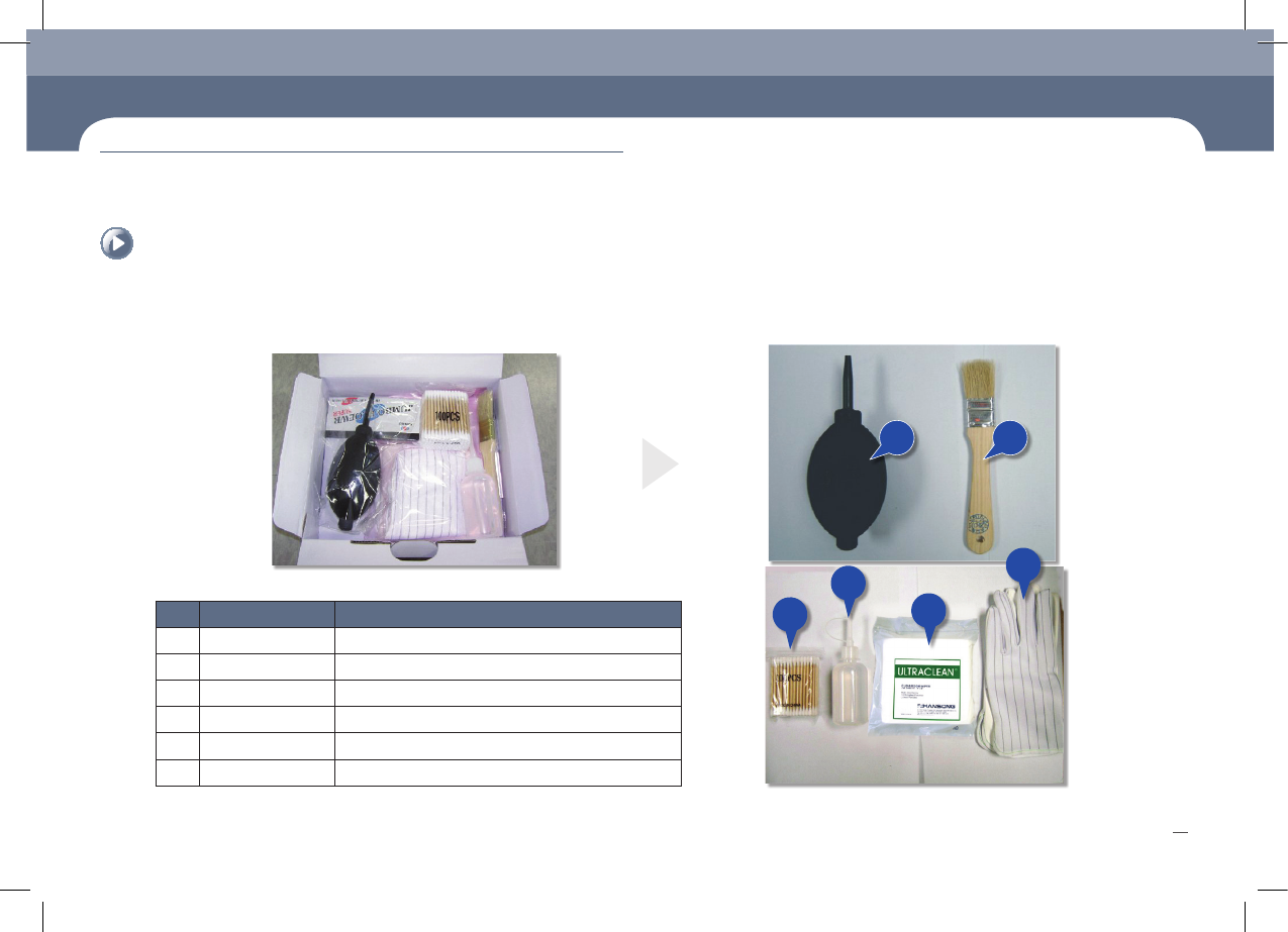 - 本设备维护时必须使用的Cleaning Kit将随机提供。 这里介绍构成Cleaning Kit的组成物和用途