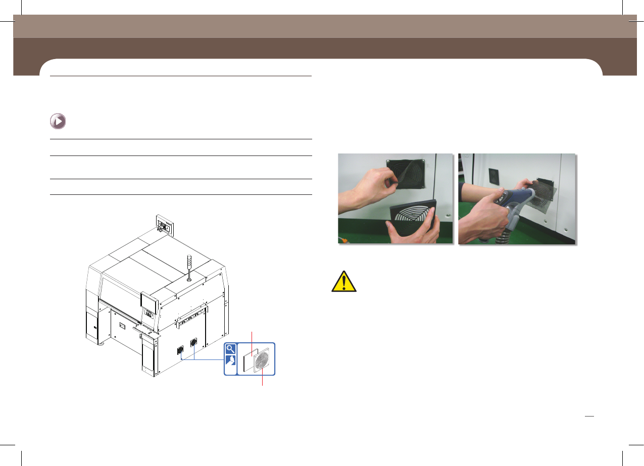 SM471 M aintenance Handbook 40 Cha pter 4 Fas t & Fl ex ibl e Chip Sho ot er Cooling Fan Filter Cooling Fan Filter Cover 每周检查 ① Cooling Fan Cover 分离 ② 使用真空清扫器清扫 Filter 真空清扫器 1. 如下图的顺序拆卸后清扫 Filte r。 ( 如果 Filter 破损请更换 …