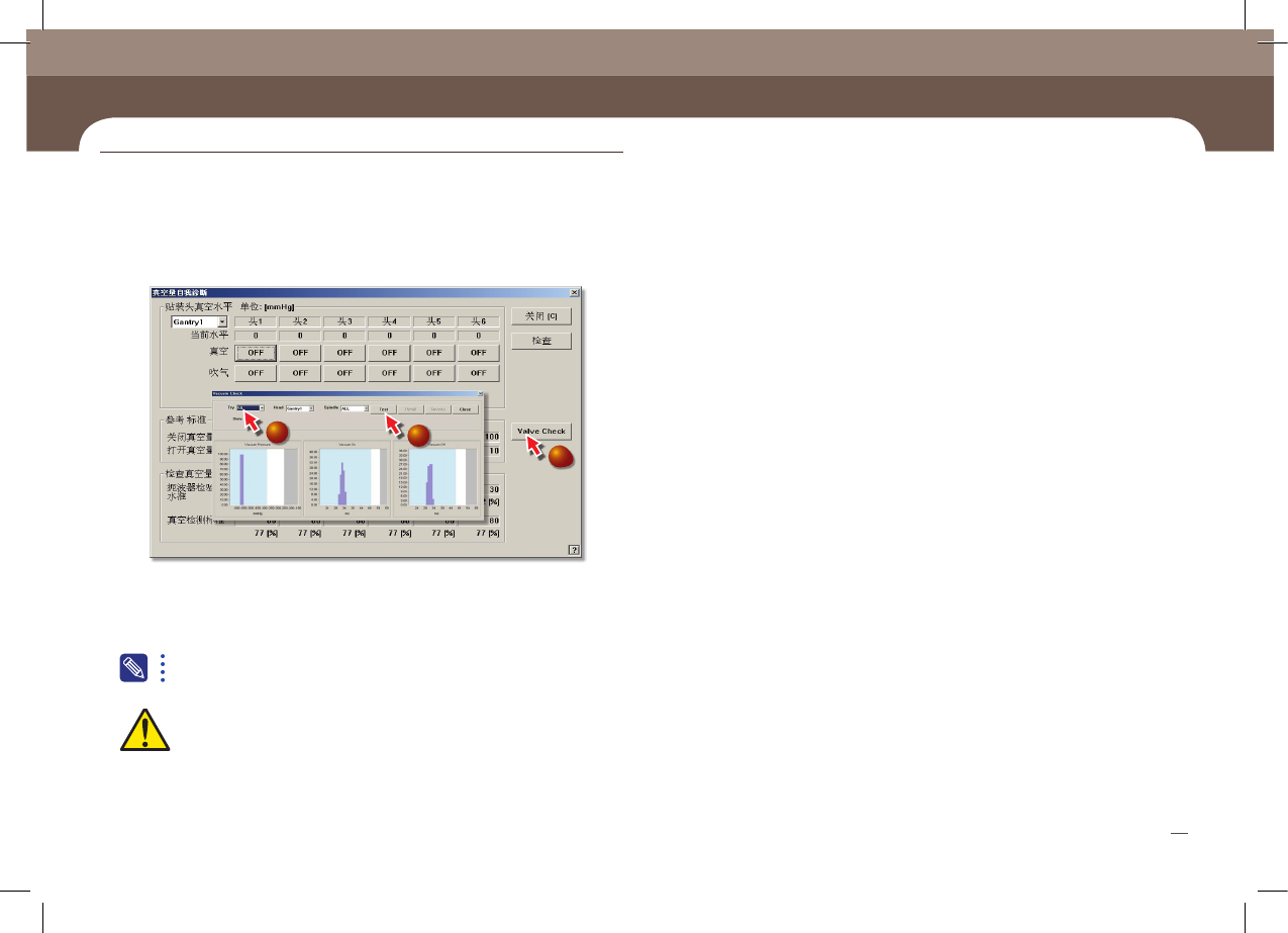 SM471 M aintenance Handbook 42 Cha pter 4 Fas t & Fl ex ibl e Chip Sho ot er 3 5 4 每周检查 4. 单击 <V alve Check> 键后 , 在 “V alve Check” 对话窗口的 <T ry> 组合框选择 V acuum ON/OFF 次数 , 然后单击 <T est> 键。 5. 检查结果为异常时 …