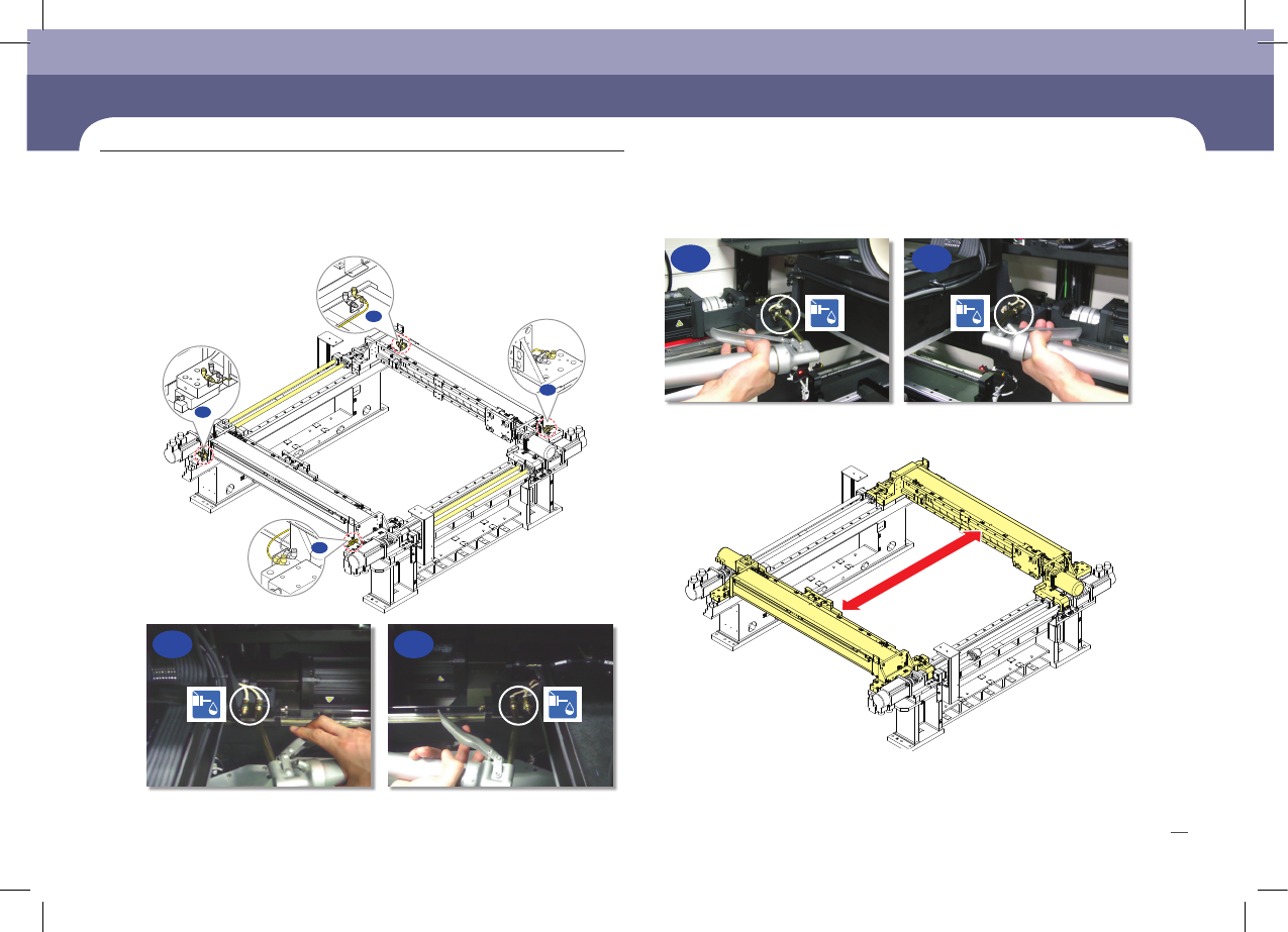 SM471 M aintenance Handbook 64 Cha pter 5 Fas t & Fl ex ibl e Chip Sho ot er A1 B1 A2 B2 每月检验 4. 用 Grease 注油器给 Grease 注油 5. 使 Front/R ear X Frame 沿着前后方向往复移动 3 次。 6. 参考 “ 解除紧急停止 (14 页 )” 解除紧急停止后重新进行作业 A1 A2 B1 B2