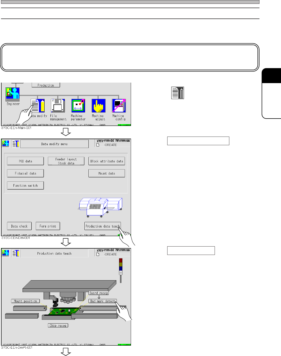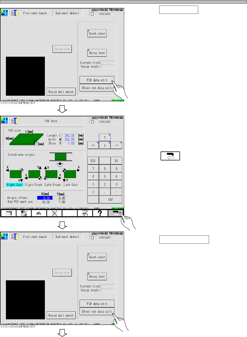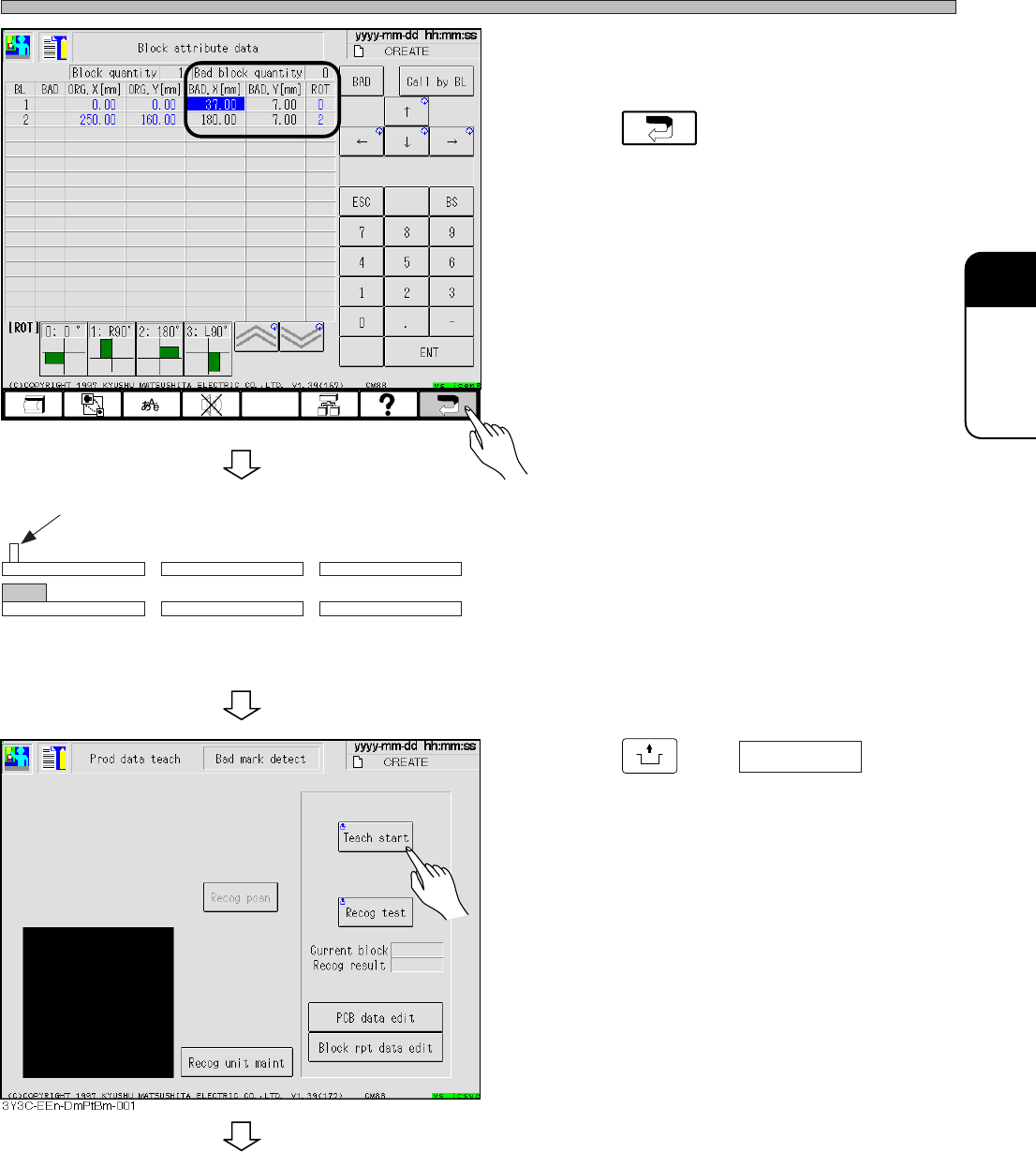 Page 5-10 T eaching Bad Mark Recognition 4 . Press PCB data edit . 5 . Check that the coordinates of bad board mark position is proper value, and correct if necessary . 6 . Press . • The screen for procedure 4 appears. 7…