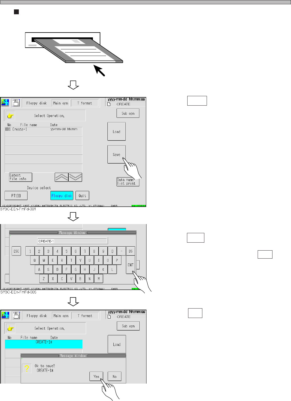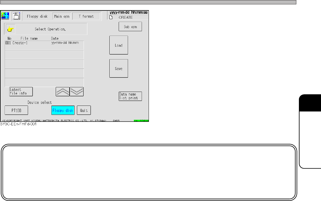 Page 6-10 File Operation of Floppy Disk Creating and saving new file 1 . Insert the initialized (without any data) floppy disk. 2 . Press Save . 3 . After entering data name, press ENT . ∗ T o quit entering data name, pr…