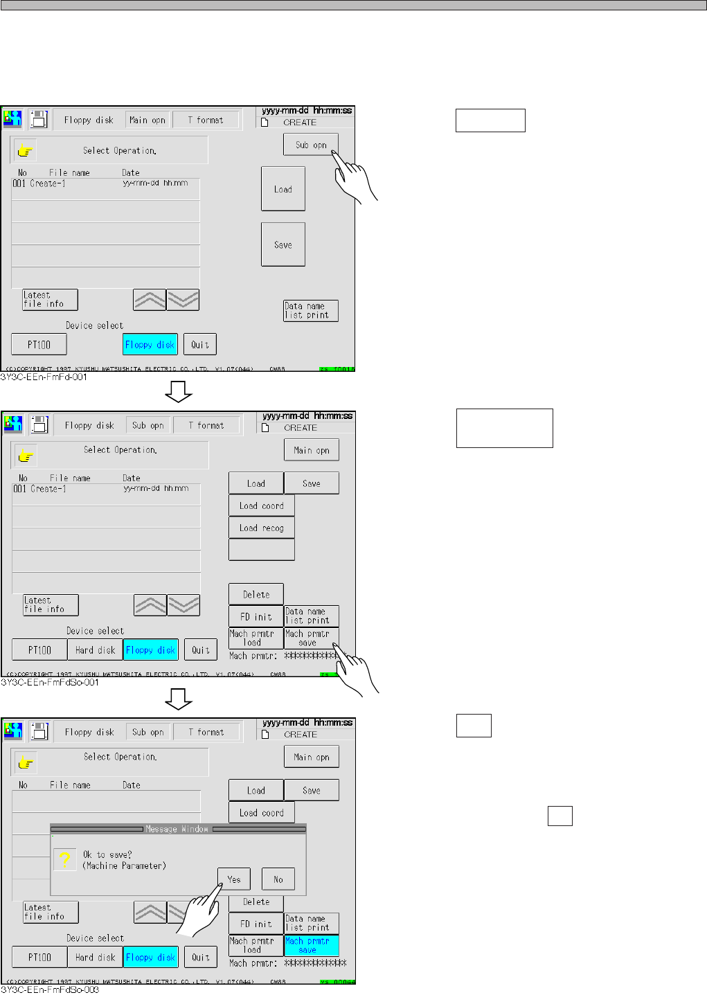 Page 6-12 File Operation of Floppy Disk b) Saving Machine parameter in the memory of machine is saved to floppy disk. 1 . Press Sub opn . • Sub operation menu screen appears. 2 . Press . 3 . Press Ye s . • The message “S…