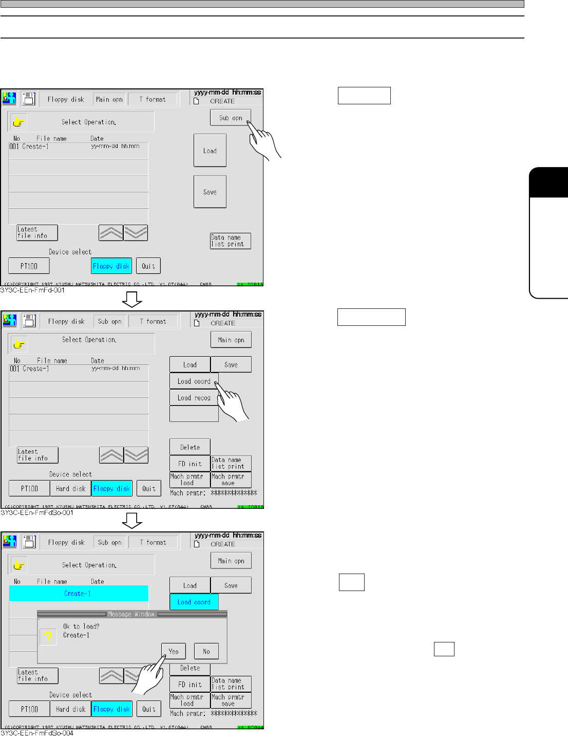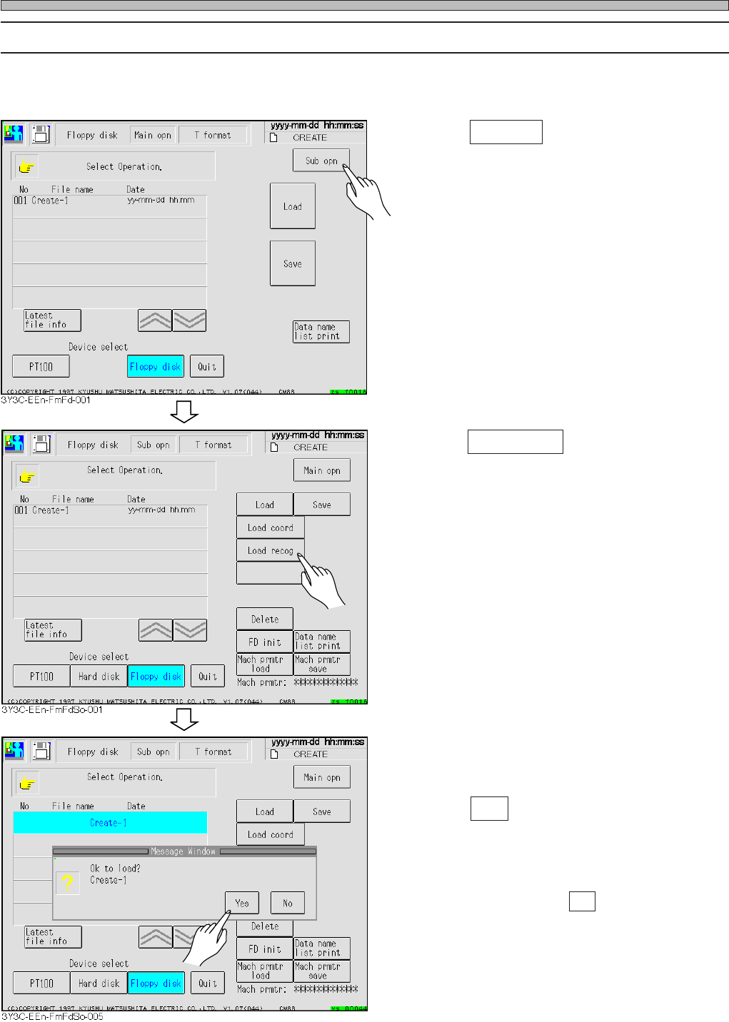 Page 6-14 File Operation of Floppy Disk 6-2-5 Loading the Recognition Data Only recognition data in production data of floppy disk is loaded to the memory of machine. 1 . Press Sub opn . • Sub operation menu screen appea…