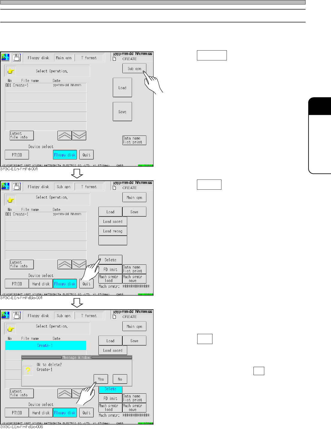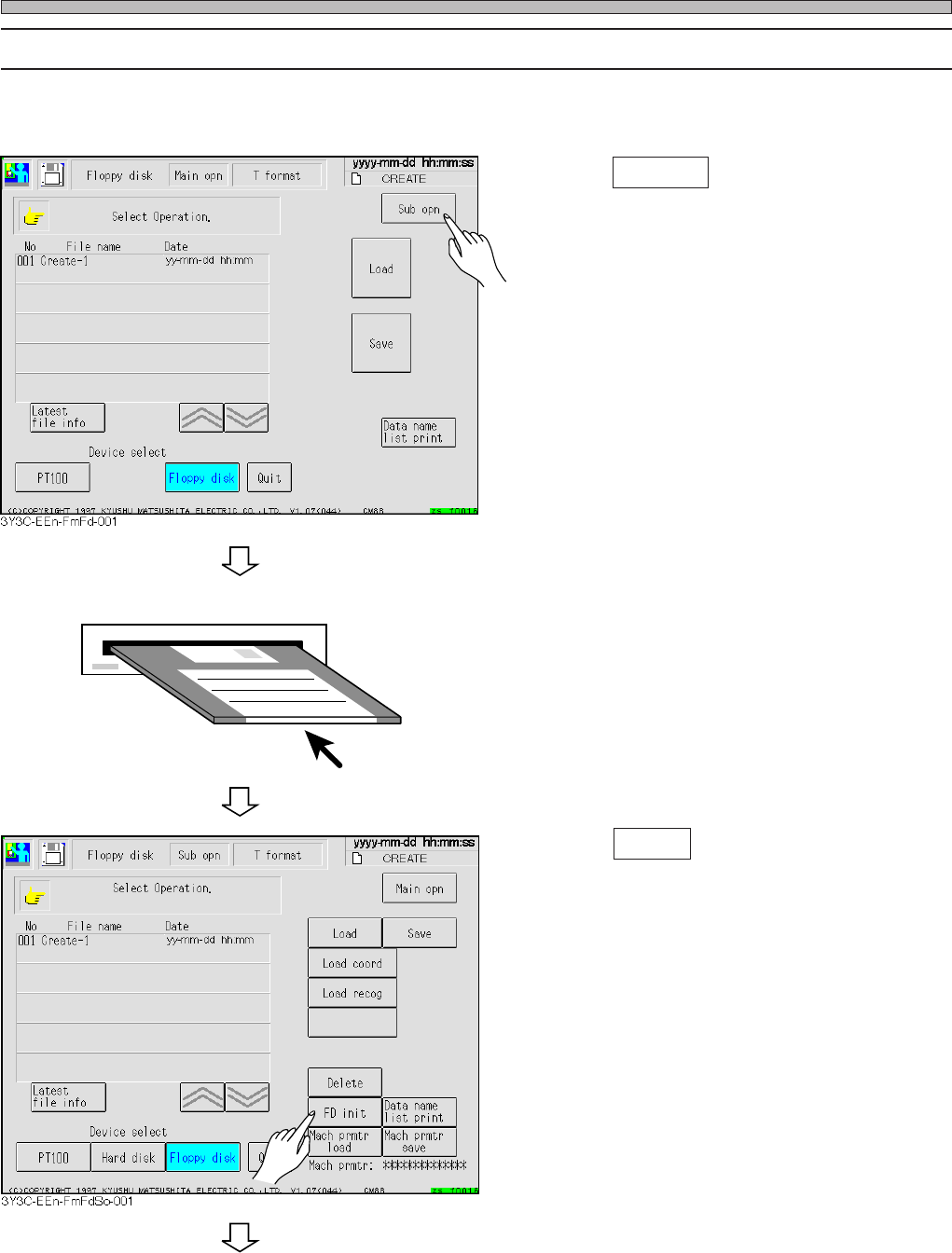 Page 6-16 File Operation of Floppy Disk 6-2-7 Initializing a Floppy Disk Initialize new floppy disk for use. Data in a floppy disk is deleted by Initializing. 1 . Press Sub opn . • Sub operation menu screen appears. 2 . …