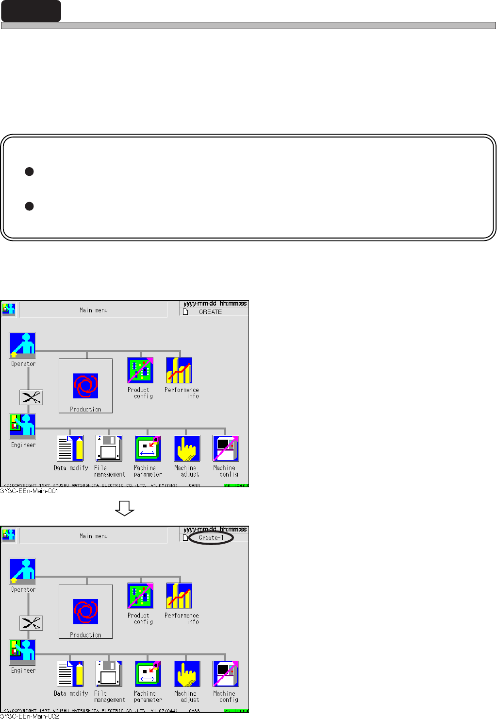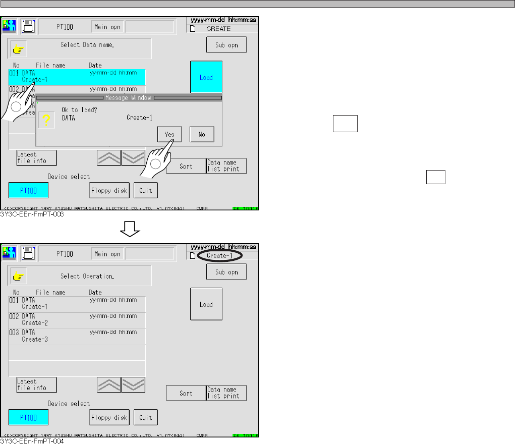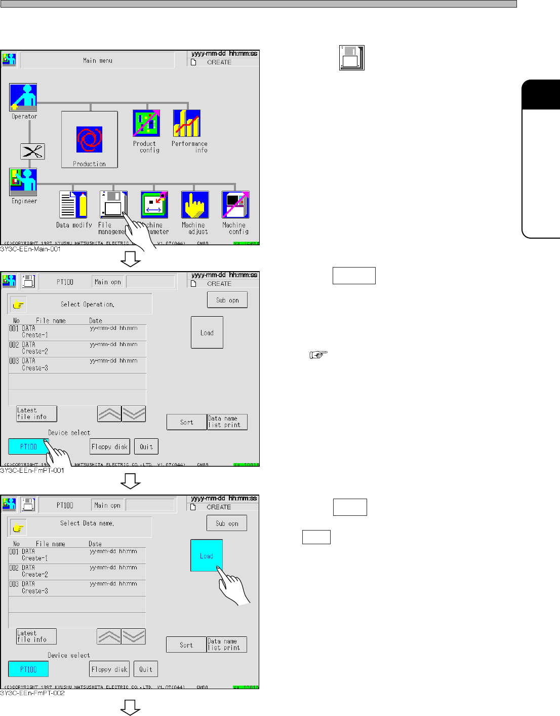Page 3-3 CHANGING PRODUCTION BOARD 3 Changing Production Data b) Loading by file operation 1 . Press File managment . • File operation screen appears. 2 . Press PT100 . • Change the object device to PT100. ∗ T o display …