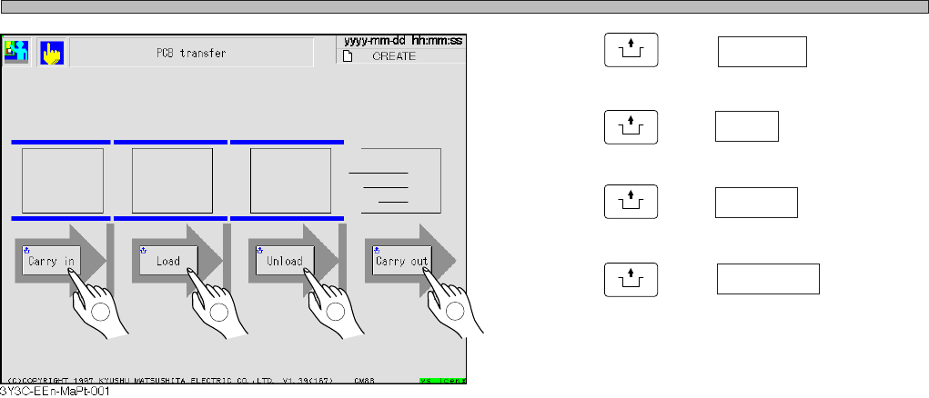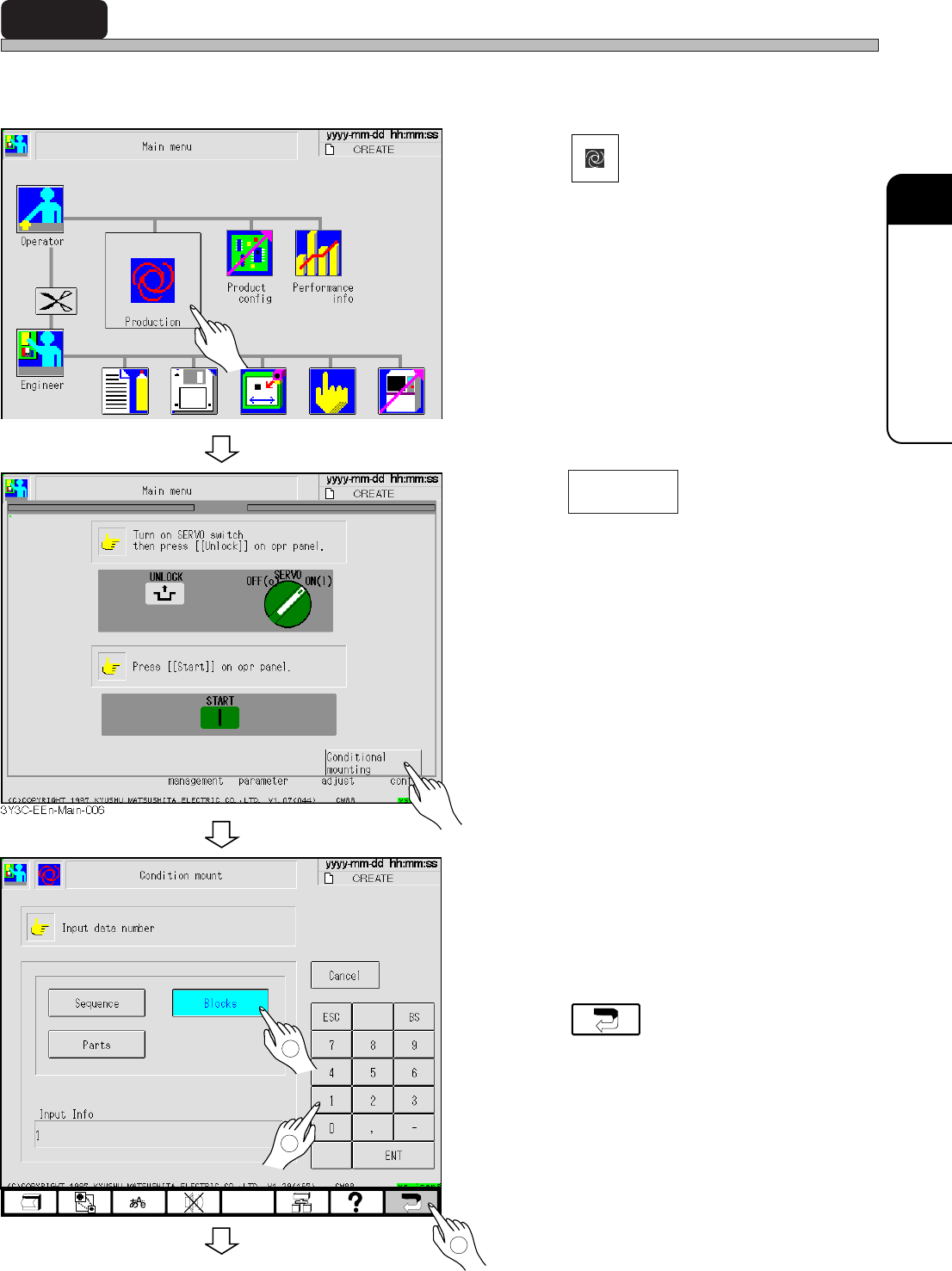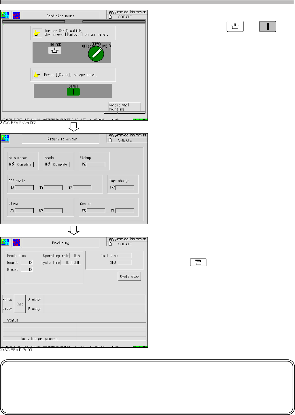 Page 3-13 CHANGING PRODUCTION BOARD 3 3-7 Checking the Mounting by Conditional Mounting Mounting by conditional mounting before starting production is checked in the following proce- dures. 1 . Press Production . • After…