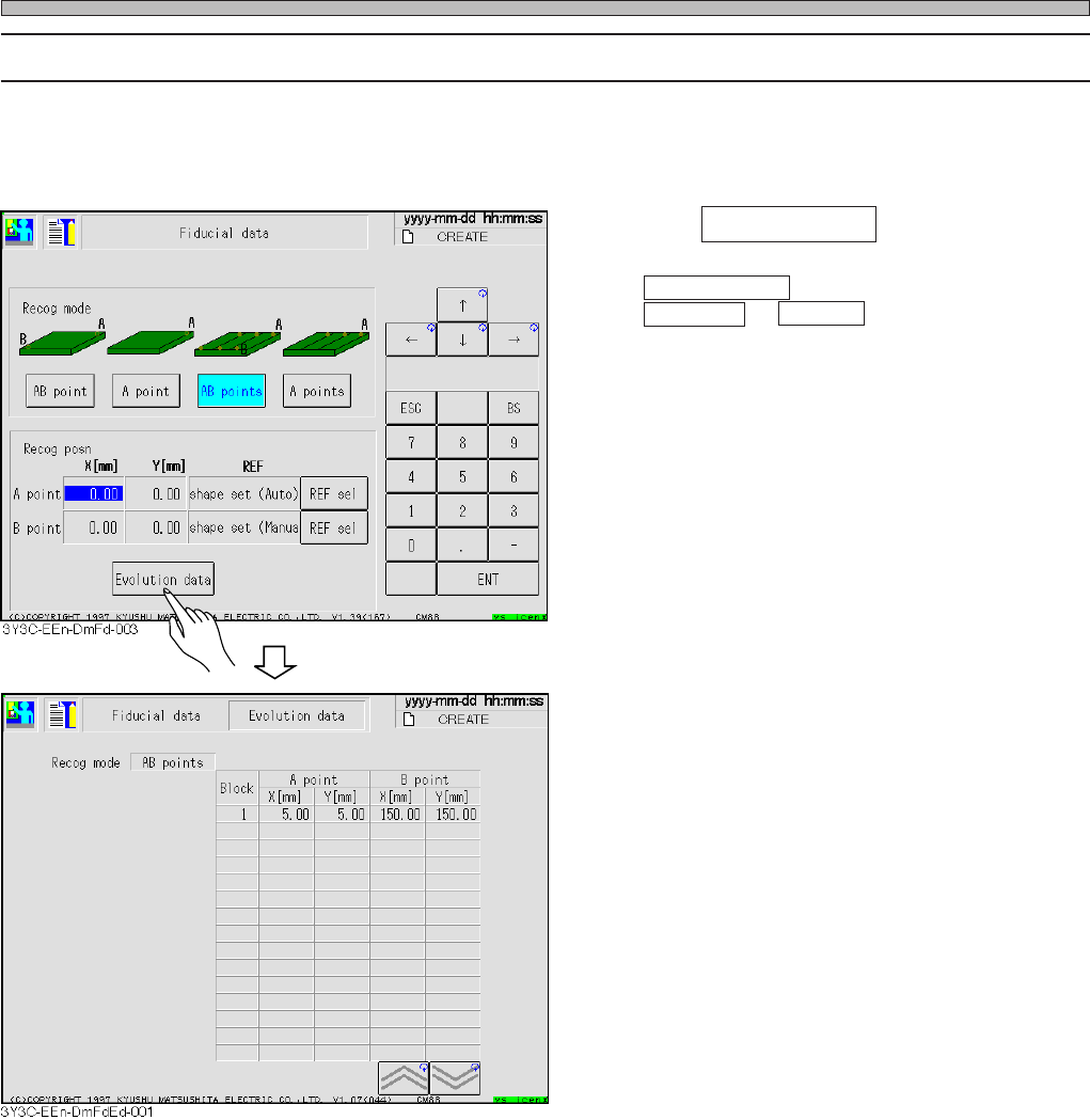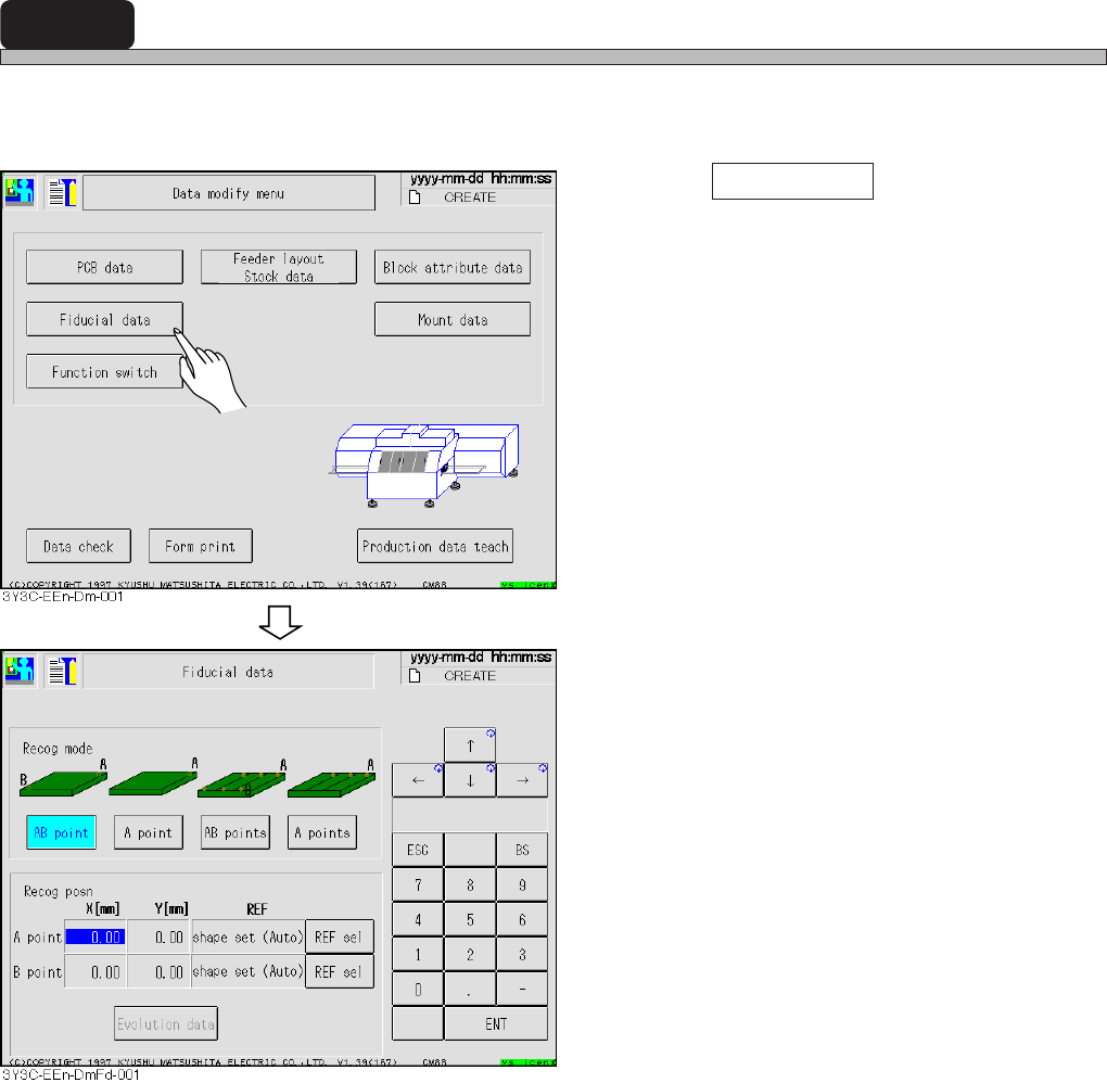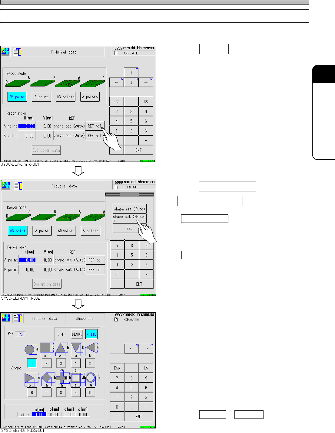 Page 4-5 DA T A MODIFICA TION 4 Fiducial Data 4-3-1 Selecting REF Basically board recognition is carried out by shape, so only shape set is selected. 1 . Press REF sel . 2 . Press shape set (Auto) or shape set (Manual) .…