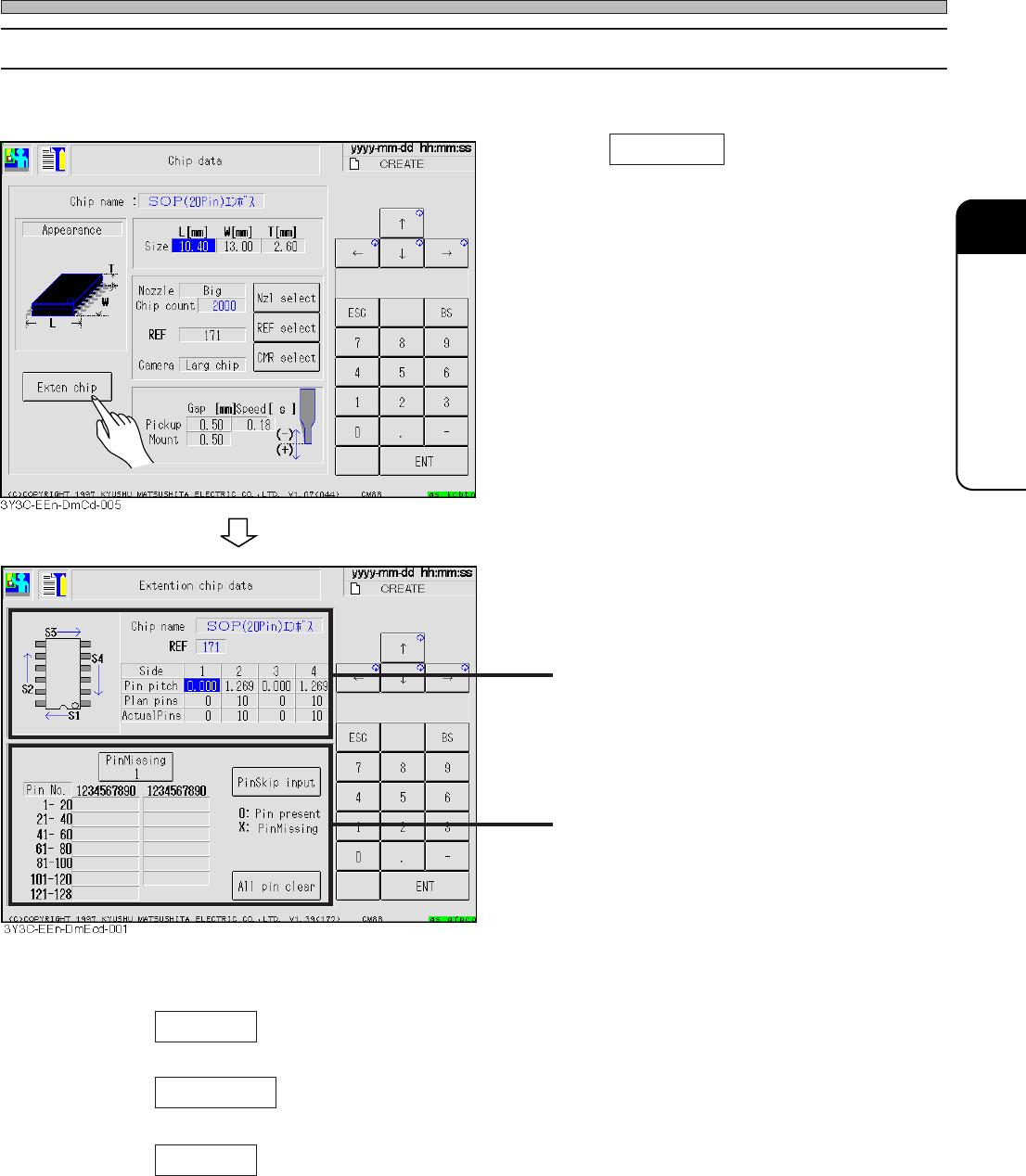 Page 4-11 DA T A MODIFICA TION 4 Chip Data 4-5-1 Extension Chip Data Applicable pin information of chip is checked and corrected. 1 . Press Exten chip . • Pin Missing ............... Select the side to indicate missing p…