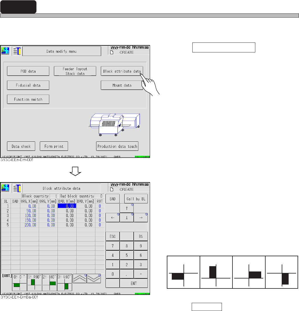 Page 4-15 DA T A MODIFICA TION 4 4-7 Mount Data Mount data is checked and corrected. 1 . Press Mount data . • Mount data screen appears. 2 . X and Y coordinates and mounting angle are corrected. • Mounting points : All p…