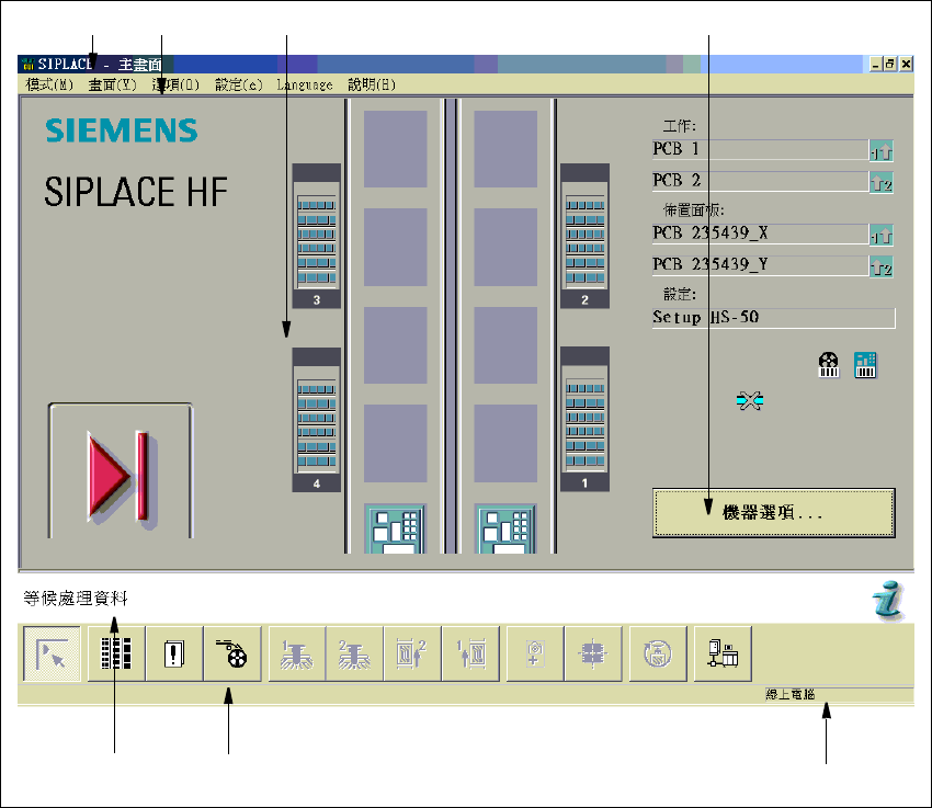 SIPLACE 軟體指導手 冊 SR.504.xx 3 圖形使用者介面 發行 0 1 /03 CH 3.2 使用者介面元件 15 3.2 使用者介面元件 3 圖 3.2 - 1 使用者介面的元件 ( 例: HF 的主畫面 ) 3 圖 3.2- 1 ㆗的重點㊠目 ( 1 ) 標題列 (2) 選單列 (3) 工作區 / 顯示區 (4) 控制裝置 (5) 狀態顯示區 (6) 工具列 (7) 訊息列 3 1 6 7 5 2 3 4