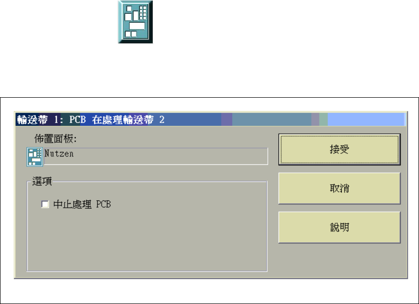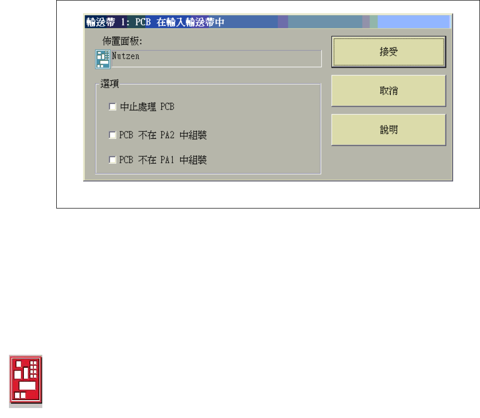 如果 PCB 以手動方式放置在處理輸送帶 1 或 2 ㆖,圖示也會變成紅色。這樣的 PCB 不會被系統接