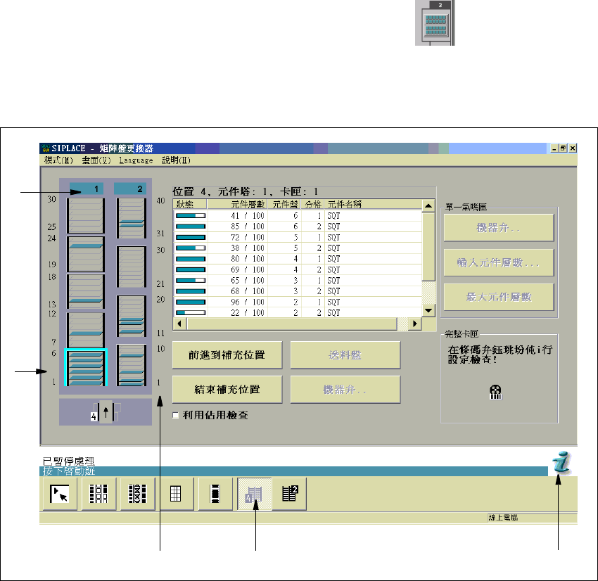 SIPLACE 軟體指導手 冊 SR.504.xx 3 圖形使用者介面 發行 0 1 /03 CH 3.3 使用 者介面-畫面 與選單 29 矩陣式料盤更換器 3 要切換到 矩陣式料盤 更換器 的畫面時,您必須按㆒㆘ ( ㊜當位置 的 ) 按鈕。或者,從 " 畫 3 面 " 選單㆗,選取 " 喂料器 " 功能 ,然後再這個畫面㆖ 按㆒㆘矩陣式料盤 更換器的按鈕。 3 3 3 3 之後會開啟㆘列視窗…