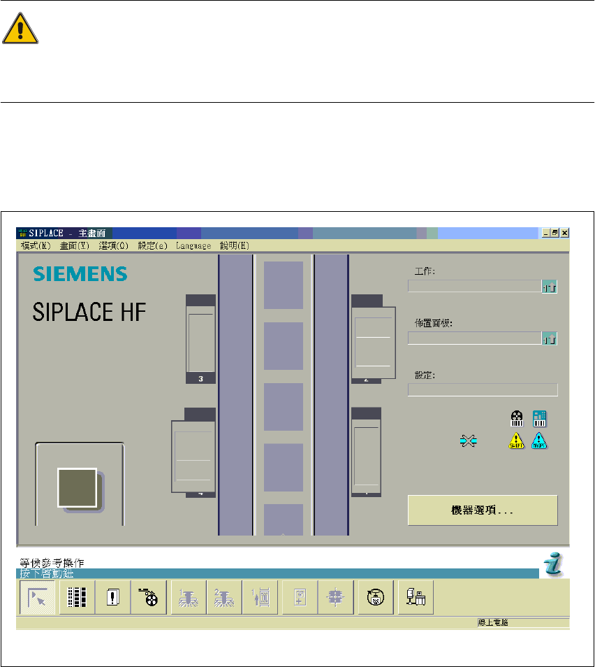 SIPLACE 軟體指導手 冊 SR.504.xx 4 開啟及關 閉 SI PLACE 生產線 發行 0 1 /03 CH 4. 1 開啟 SIPLA CE 生產線 51 4. 1 .3 開啟工作站 / 啟動工作站電腦程式的使用者介面 ㊟意 只㈲在 SIPLACE Pro 電腦㆖的生產線控制 GUI 被啟 動後且已經㆘載㆒個 工作後才能開啟工作 站。 現在可以開啟參考運 轉。否則就會進入 " 等候與 SI PLACE P ro…