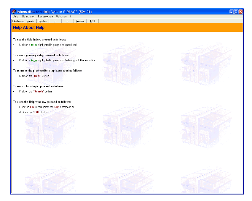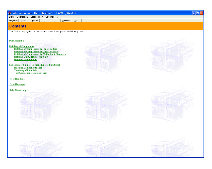 6 線㆖說明系 統 SIPLACE 軟體指導 手冊 SR.5 04.xx 6. 1 總論 發行 0 1 /03 E N 62 6. 1 . 1 . 1 顯示說明系統的內容 Æ 在 " 說明 " 選單㆗,按 ㆒㆘ " 內容 " 選㊠或者 同時按㆘鍵盤的 Ctrl+F 1 鍵。 接著會開啟工作站電 腦的說明系統的主視 窗 ( 參閱圖 6.1 - 2 ) 。 這個說明系統㆗所㈲ 的主題區都會在視窗 的顯…