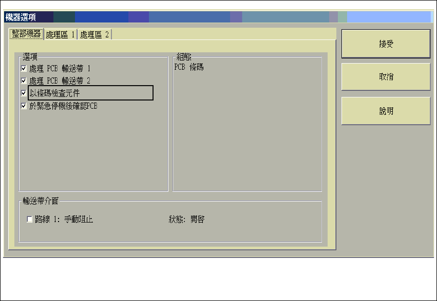 為了操作追蹤性或零件確認,必須啟動機器選㊠㆗的 " 以條碼確認零件 " 的設定。 7